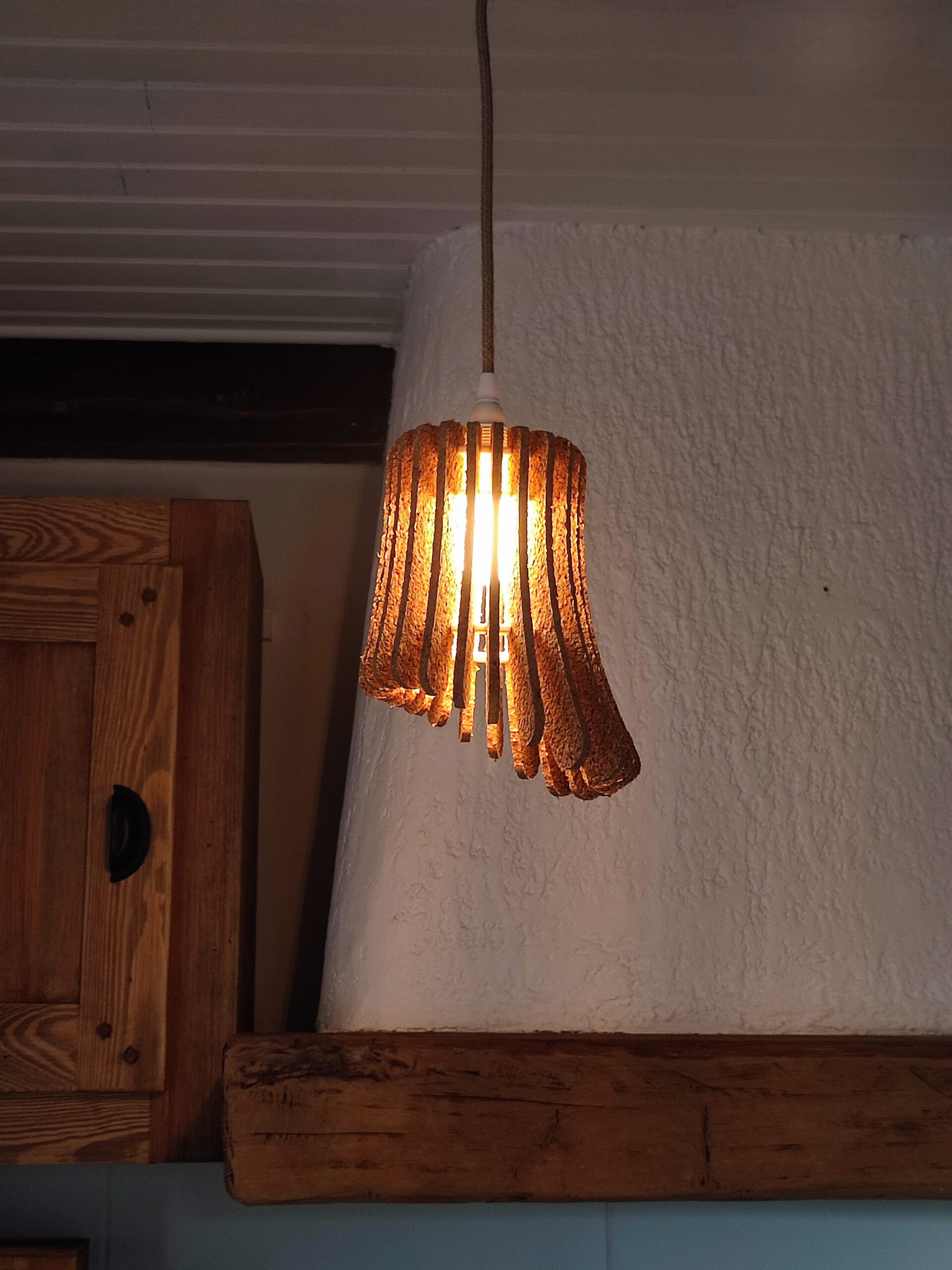 Lampe suspendue Arum liège mini Entre technologie et artisanat éthique 📍Fabrication artisanale dans le Gard, France Inspirée par l’élégance naturelle de la fleur d’arum, cette suspension associe une structure circulaire légère en PLA imprimé en 3D à des lamelles de liège disposées en corolle. Son design organique évoque le mouvement délicat d’une fleur qui s’ouvre, offrant un jeu de lumière doux et chaleureux. Éco-conçue, elle met en valeur des matériaux naturels et responsables, comme le liège et le câble textile en jute, tout en intégrant un système électrique de qualité. Avec son diamètre de 16,5 cm, Arum trouve sa place aussi bien en pièce unique qu’en composition multiple, apportant une touche de poésie contemporaine à tout intérieur. 📏 Dimensions : Ø 165 mm x H 200 mm ⚖️ Poids : ≈ 230 g 🪵 Matériaux : liège naturel et PLA (biomatériau issu du maïs – Espagne) 💡 Composants électriques : douille E14, mini Pavillon cylindrique câble textile en jute