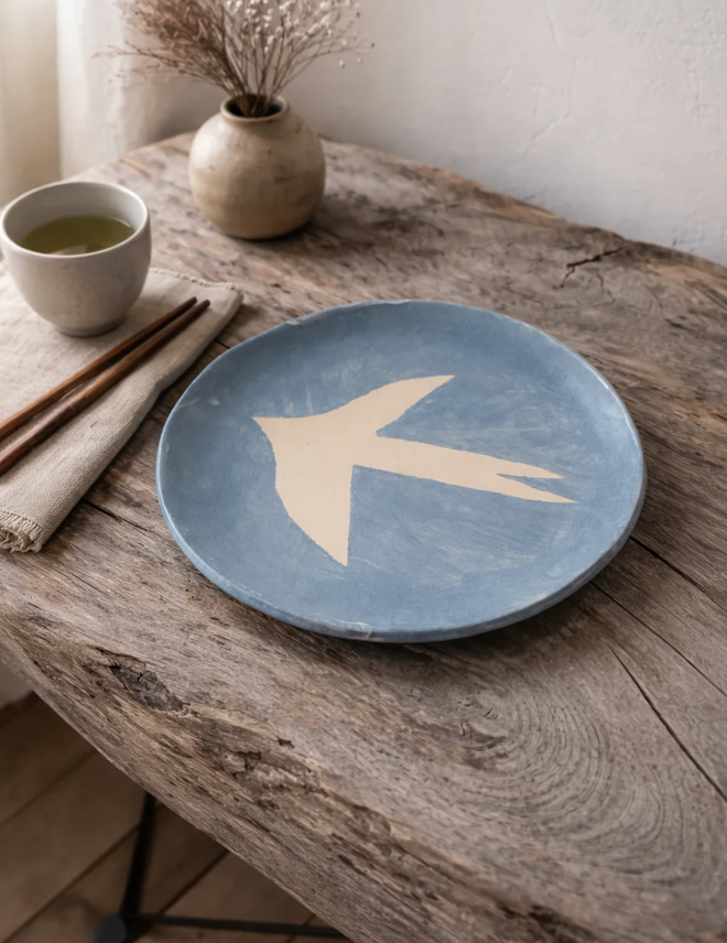 Découvrez notre assiette en céramique artisanale, véritable pièce signature pour votre salon. Sa teinte bleu doux met en valeur une délicate silhouette d’hirondelle beige, symbole de légèreté et de liberté. Chaque assiette est façonnée à la main, offrant des variations uniques et un charme authentique à votre intérieur. Diamètre : 25 cm aprox. Après une semaine de séchage, la pièce part en cuisson « biscuit » pendant 12 heures. Elle est ensuite décorée à l’engobe, plongée dans l’émail et cuit une nouvelle fois à 1230° durant 16 heures. CRÉATION ARTISANALE : Les pièces étant fabriquées entièrement à la main, nous ne pouvons assurer une similitude parfaite avec le produit photographié. L’acheteur accepte qu’il puisse y avoir des légères différences de couleur, de forme et/ou de taille. Chaque objet est unique et fabriqué en petites séries.