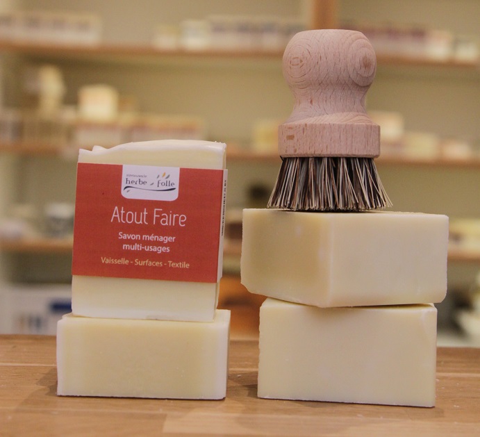 Atout faire est un savon ménager multi-usages pour la vaisselle, les surfaces et les textiles. Plus besoin d’avoir plusieurs produits qui encombrent vos placards, ce savon est multi-tâches ! Mode d’emploi : Frottez le savon sur une éponge ou une luffa, ou bien directement sur la tache. Frottez et rincez. Savon ménager à base d’huiles d’olive et de coco biologiques, fabriqué en saponification à froid. Vendu à l’unité, brosse vendue séparément. Poids : 200 grammes Tenir hors de portée des enfants. Eliminer le contenu conformément à la réglementation locale. Ingrédients : 30 % et plus de savon.
