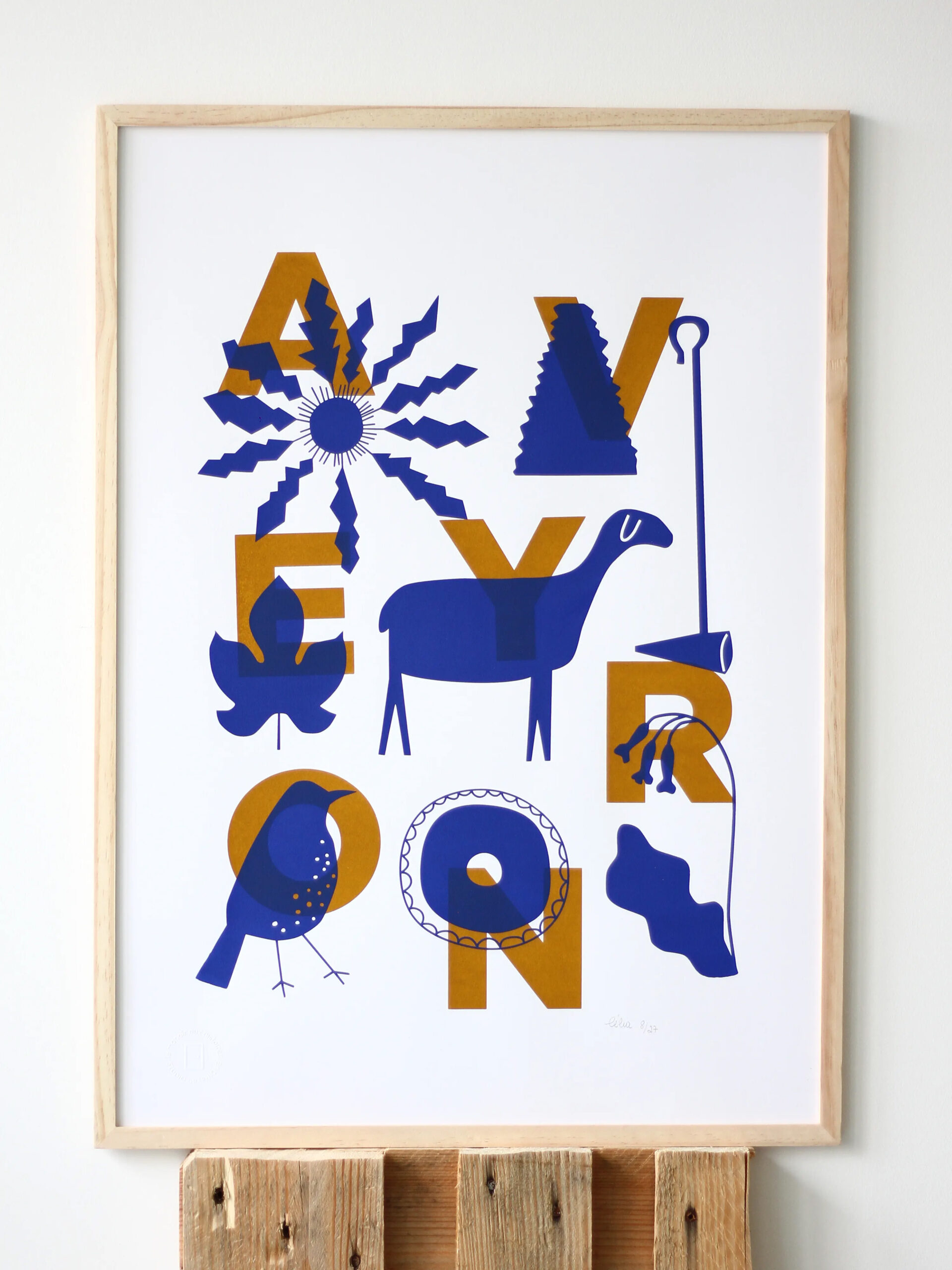 Impression 2 passages : bleu et ocre. Dimension de l’affiche : 50×70 cm. Tirage en 27 exemplaires Papier Olin Rough 300g/m2. Numérotée et signée. Cadre non inclus. Une affiche signée Célia. Sérigraphie artisanale en série limitée. Création originale le manoir aux histoires.