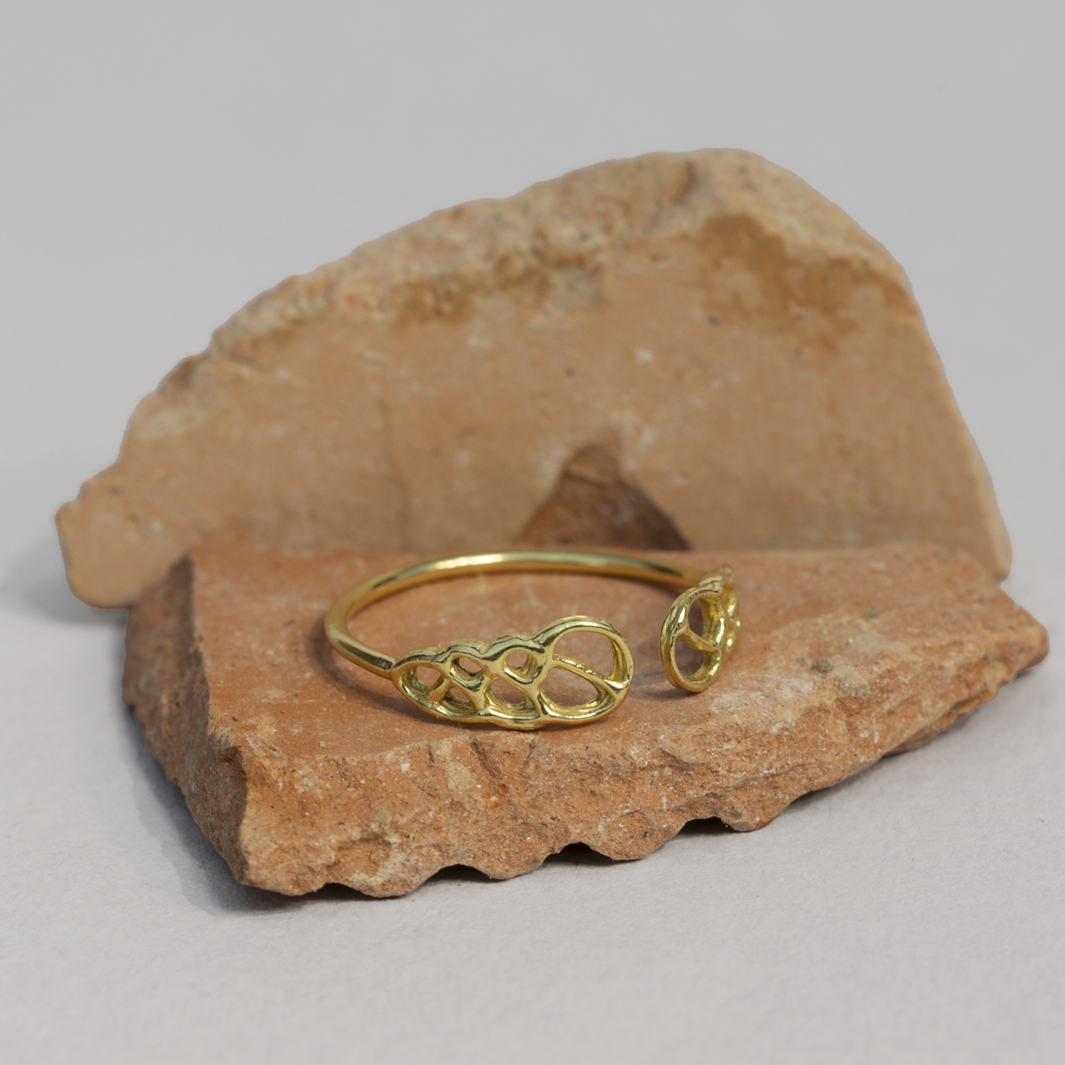 Bague en or 750/1000 équitable certifié Fairmined. Avec deux motifs, cette bague non fermée est ajustable.