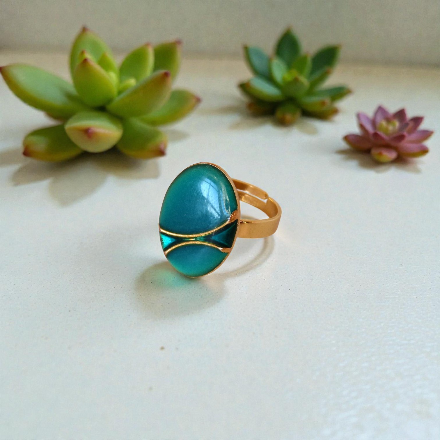 Cette bague audacieuse et poétique met en lumière un ancien bouton vintage transformé en joyau contemporain. Sa couleur turquoise, aux reflets profonds et lumineux, est traversée de deux lignes dorées qui évoquent les courbes du vent ou les sillons du temps. Montée sur un anneau doré ajustable, elle incarne l’alliance entre mémoire et modernité. Anneau ajustable en laiton doré à l’or fin 24k. Dimensions : largeur :14,8 mm – hauteur : 20,8 mm