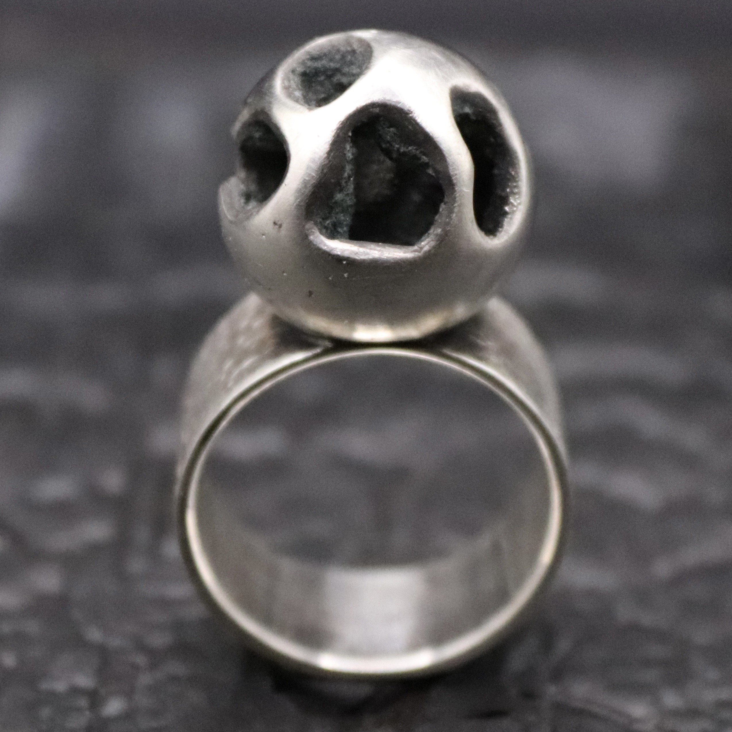 Bague en argent issue d’une coulée dans la Terre de Delft – Poussière d’argent oxydée dans les creux – Finition mate – Taille 56