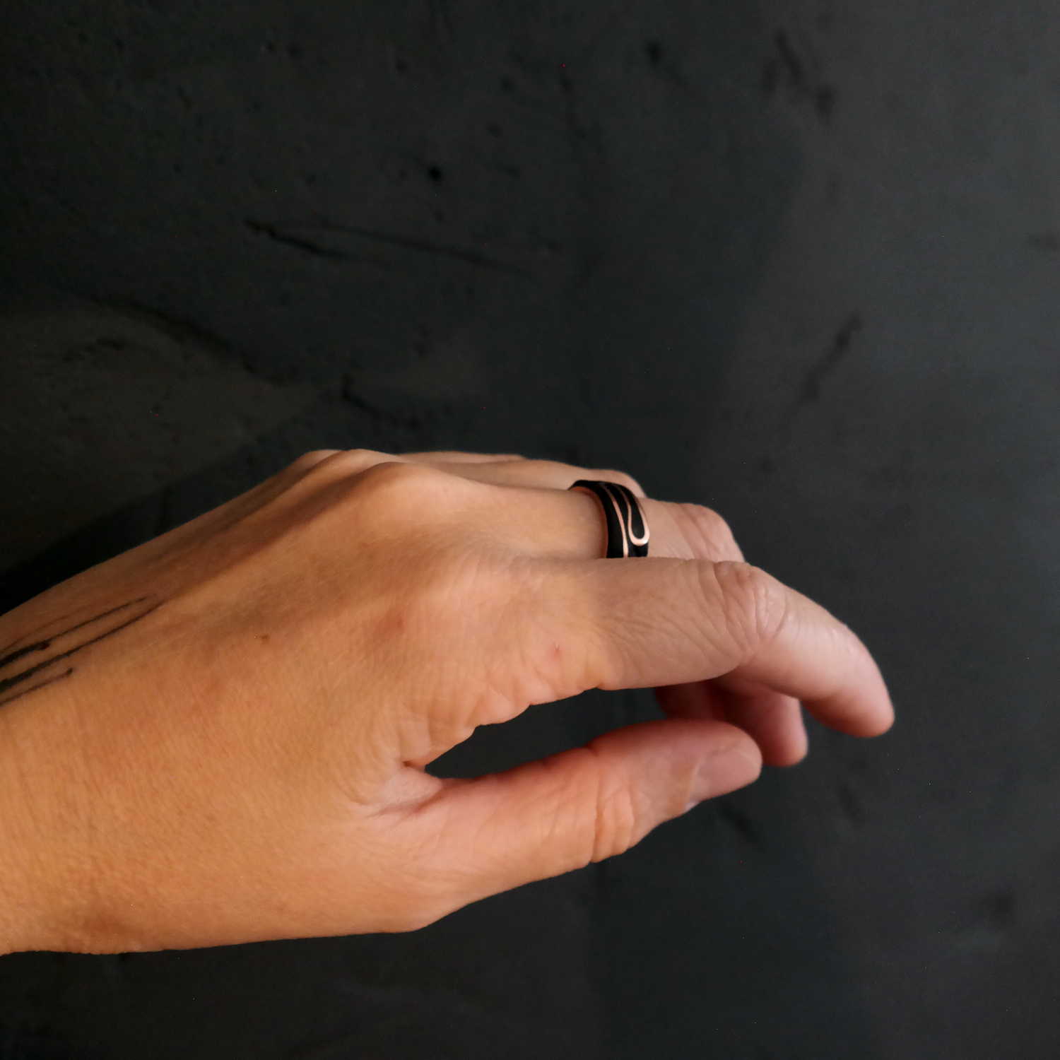 Taille: 55 Bague en cuivre, charbon et résine epoxy La partie charbon est faite à partir d’un mélange de charbon et de résine epoxy, le rendant résistant au chocs et à l’eau et ne laissant aucune traces sur la peau. Mes bijoux sont fabriqués entièrement à la main dans mon atelier au milieu des Pyrenées Orientales. Chaque pièce est unique, avec son nom et son identité. Un talisman qui vous accompagnera toute votre vie.