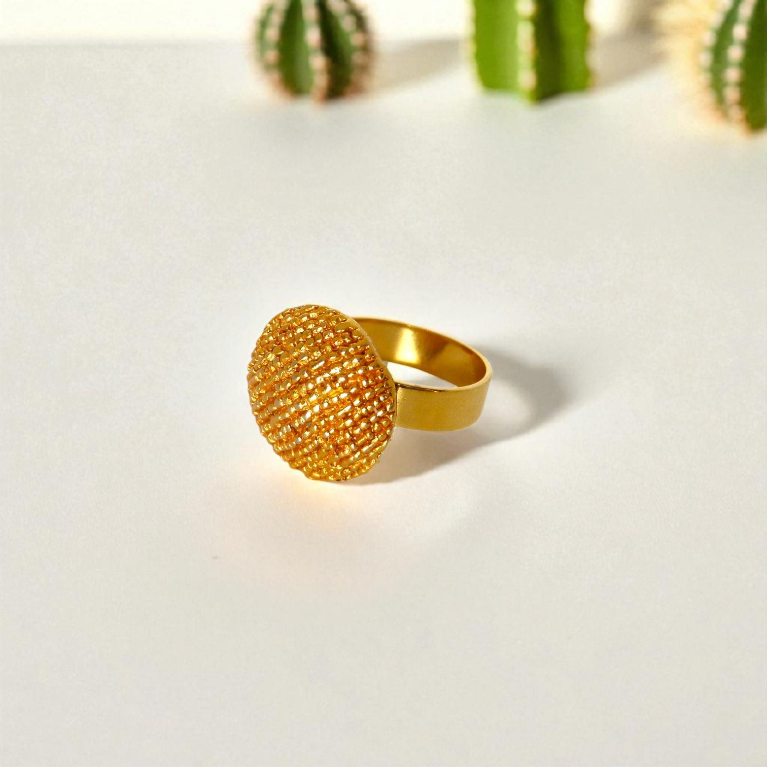 Cette bague élégante est une pièce unique, réalisée à partir d’un ancien bouton soigneusement restauré et transformé en bijou raffiné. Son design texturé, en forme de dôme doré, capte la lumière avec subtilité et ajoute une touche vintage et sophistiquée à toute tenue. Anneau ajustable en laiton doré à l’or fin 24k.