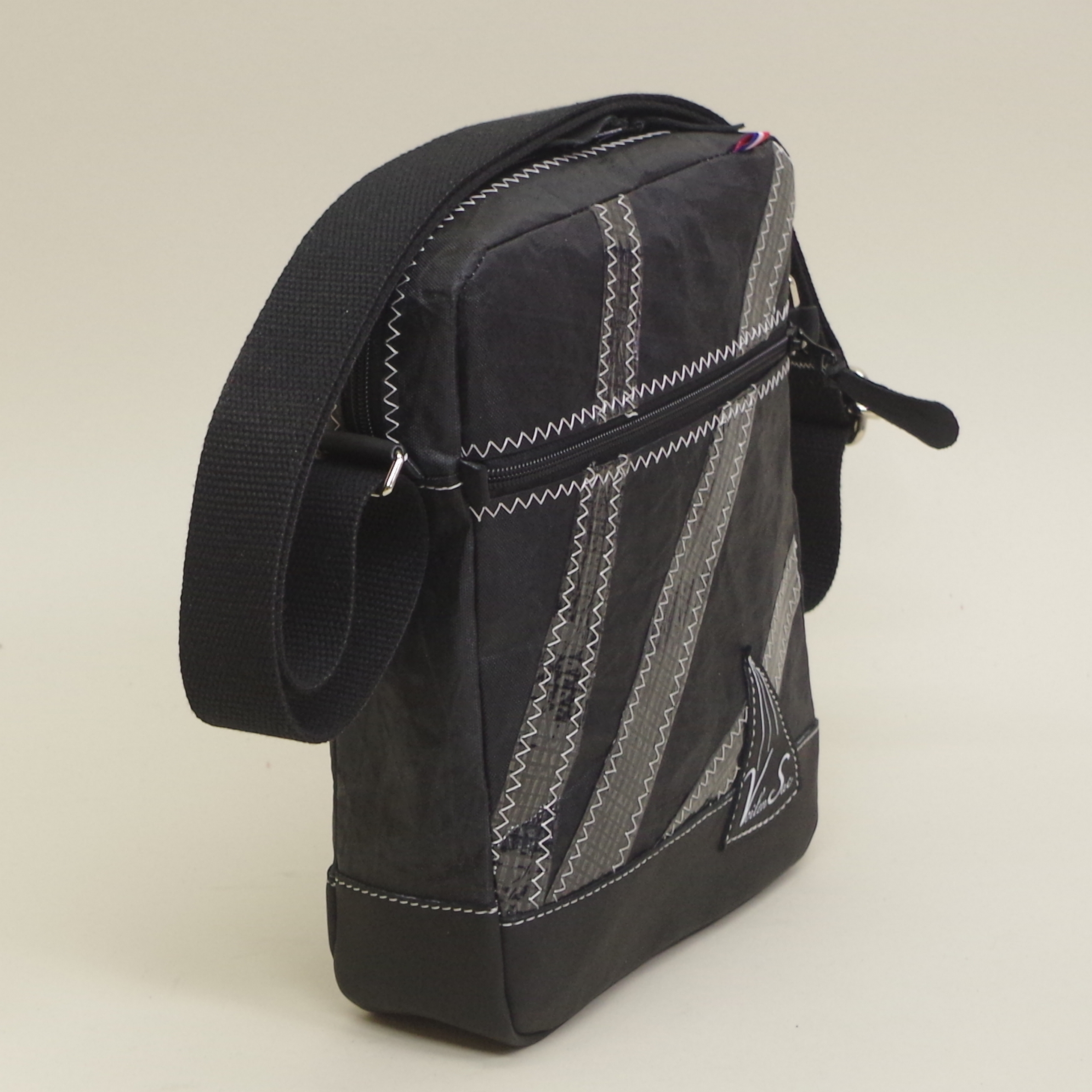 Sacoche Baise en ville en voile de bateau et cuir de Millau. Voile Black Trilam Cuir vachette noir tanné à Millau. Une poche zippée extérieure, une plaqué intérieure. Large bandoulière en sangle réglable. Hauteur: 23, cm, Largeur: 17,5 cm, Epaisseur: 6 cm, Poids: 190 g.