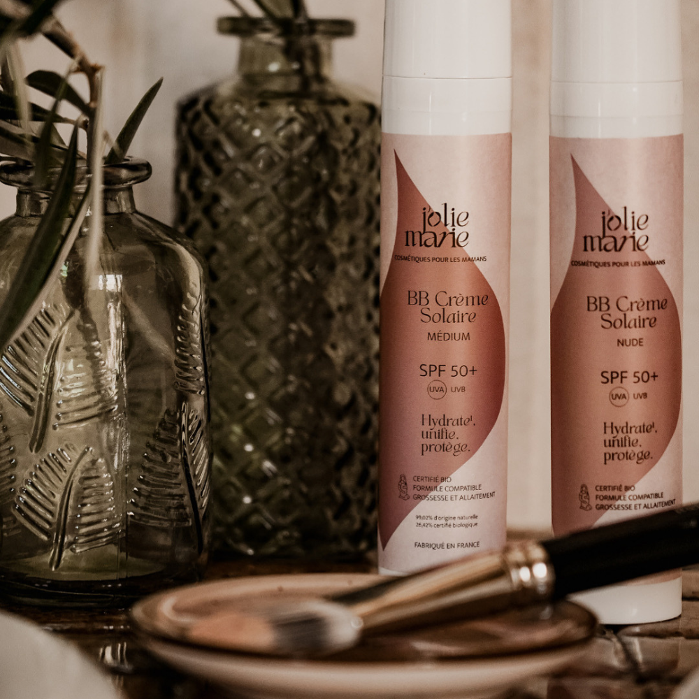 Le masque de grossesse (mélasma) touche 7 femmes enceintes sur 10. Notre BB Crème Solaire SPF50+ est spécialement formulée pour prévenir l’apparition des taches brunes tout en unifiant votre teint naturellement. Ce qu’elle fait pour vous : Protection UV maximale — bloque les rayons responsables du mélasma Teint unifié et lumineux — couvre les imperfections sans effet masque Texture non grasse — pénètre rapidement, ne brille pas 100% sûre pour bébé — sans perturbateurs endocriniens, certifiée bio Formule clean bio certifiée 99,8% d’ingrédients naturels. Fabriquée en Occitanie avec huile d’olive bio de l’Aude. Sans parabènes, sans silicones, sans nanoparticules. Testée dermatologiquement. Recommandée par les sages-femmes. Utilisable dès le 1er trimestre et pendant l’allaitement. Disponible en 2 teintes : Nude et Médium. Complétez votre routine ! Associez votre BB Crème avec l’Huile Anti-Vergetures Bio et le Lait Corps Hydratant Bio pour une protection complète corps et visage.