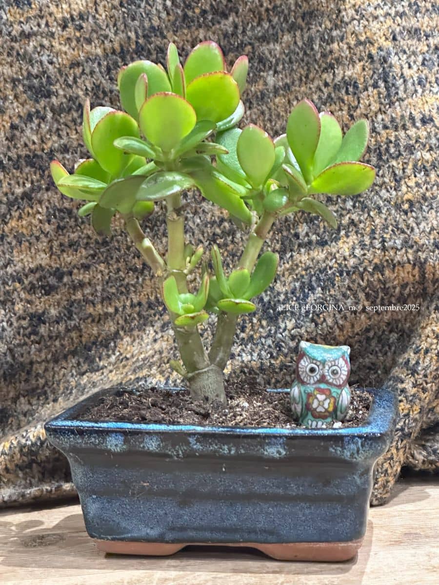 _Jardin Succulent & Poétique _Bonzae#3 _Composition végétale réalisée à partir de plantes succulentes cultivées par mes soins et d’objets de 2nde main chinés en France _Pot à bonzaï _Hibou miniature en émaux cloisonné _Substrat pour plantes grasses BIO _Succulentes variées _35€ _Ref CO25032