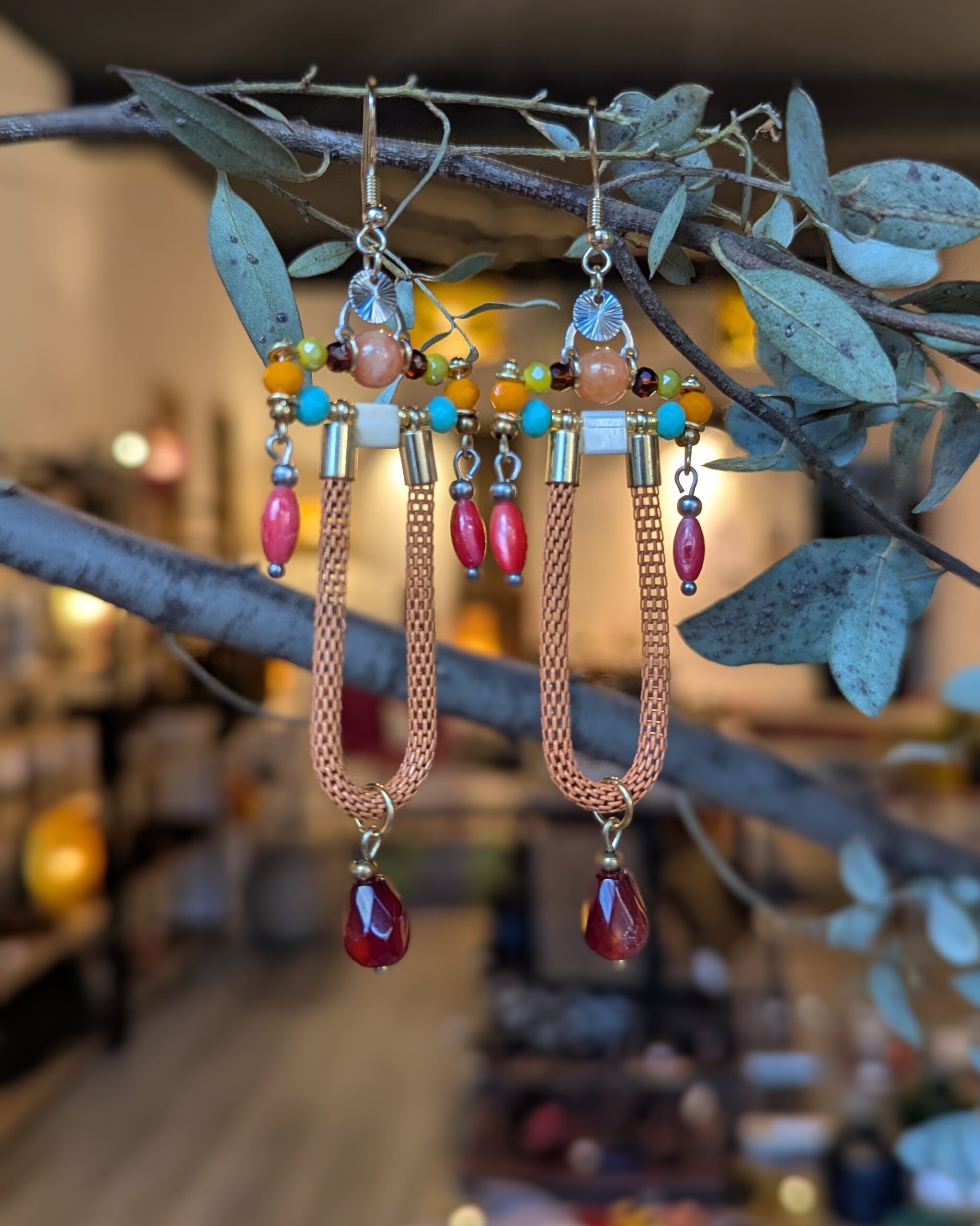 Boucles d’oreille ethniques d’inspiration Inca, composées de pierres semi précieuses, écorces de bois et acier inoxydable