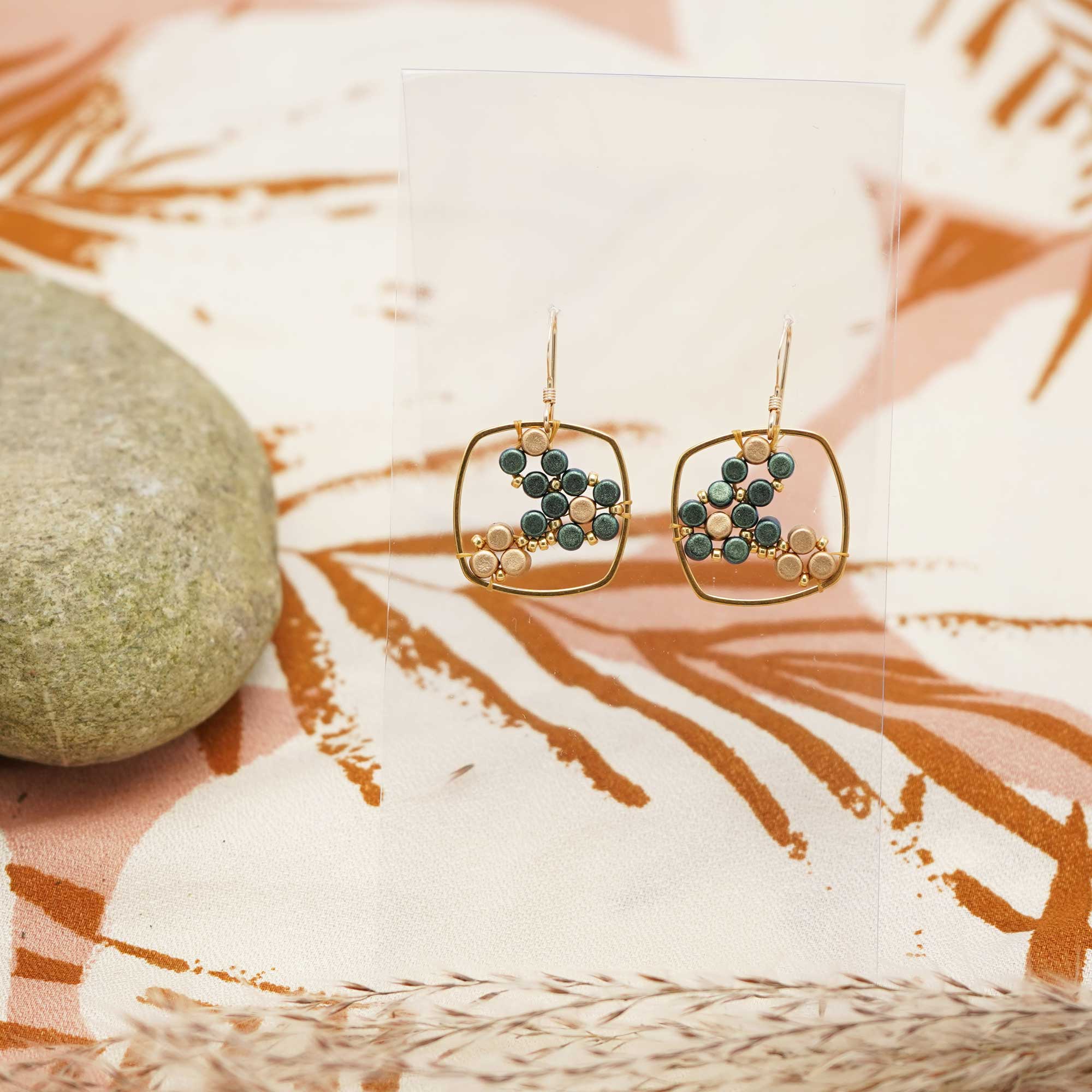 Boucles d’oreilles tissées main. Crochets en acier inoxydable. Disponibles à la boutique les pépites Occitanes – Rue saint Rome à Toulouse