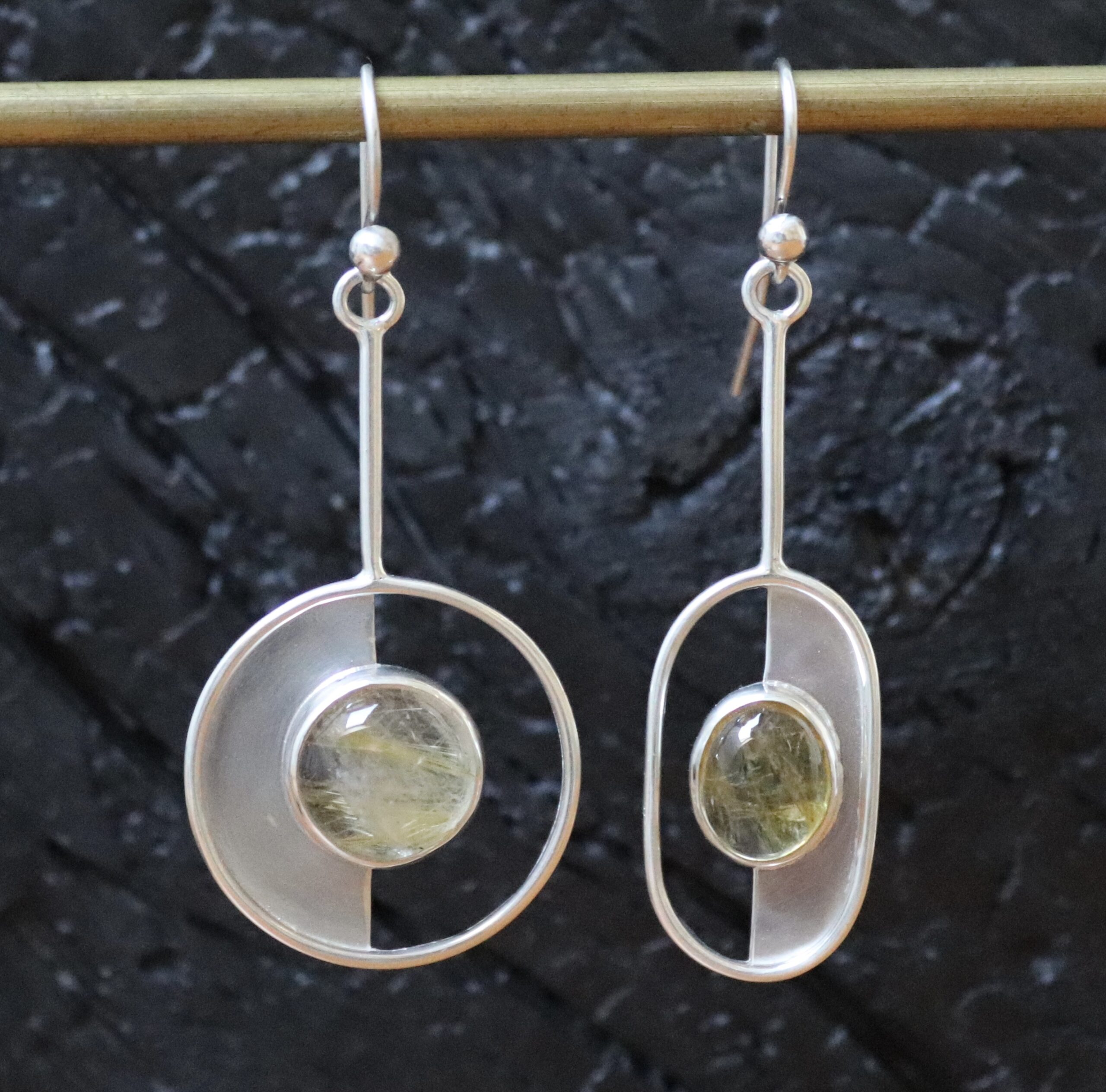 Paire de boucles d’oreilles asymétriques fabriquées en argent massif avec quartz rutile – Hauteur 45 mm – Poids 4.60 grammes.