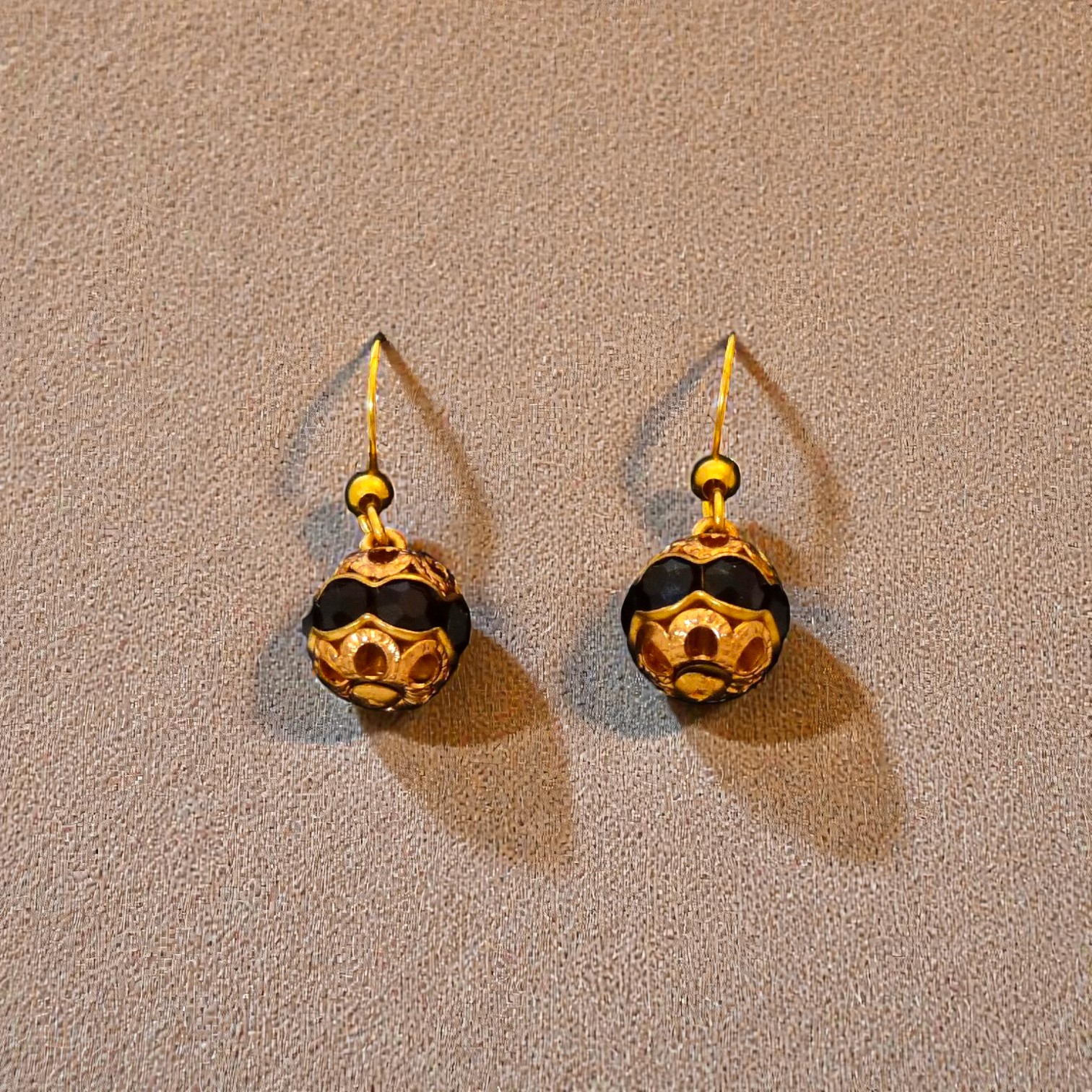 Ces boucles d’oreilles sont nées de la transformation de deux anciens boutons au charme rétro. Leur design sphérique associe un noir profond à des détails dorés finement travaillés, pour un rendu à la fois élégant, original et intemporel. Portées, elles apportent une touche sophistiquée et lumineuse, aussi bien à une tenue du quotidien qu’à une tenue plus habillée. Supports en acier inoxydable. Diamètre : 9,8 mm