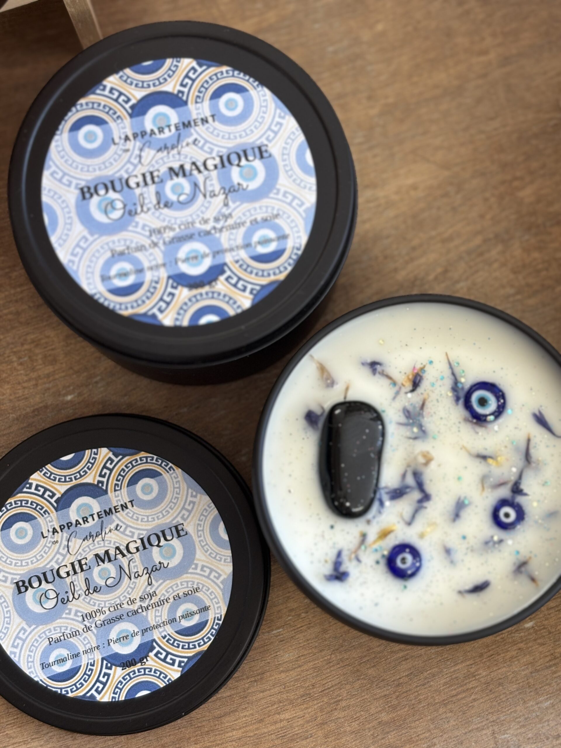 Coulée à la main en occitanie, cette bougie artisanale associe cire de soja européenne sans OGM ni pesticides, parfum de Grasse sans CMR et mèche en coton non traité. Elle renferme la puissante alliance de l’oeil de Nazar et de la tourmaline noire. oeil de Nazar : talisman ancestral reconnu pour repousser le mauvais oeil et détourner les énergies malveillantes. Tourmaline Noire : Pierre de protection extrême, qui crée un véritable bouclier énergétique. En l’allumant vous invitez un rituel de protection profonde, pour purifier votre espace et maintenir les ondes négatives à distance.