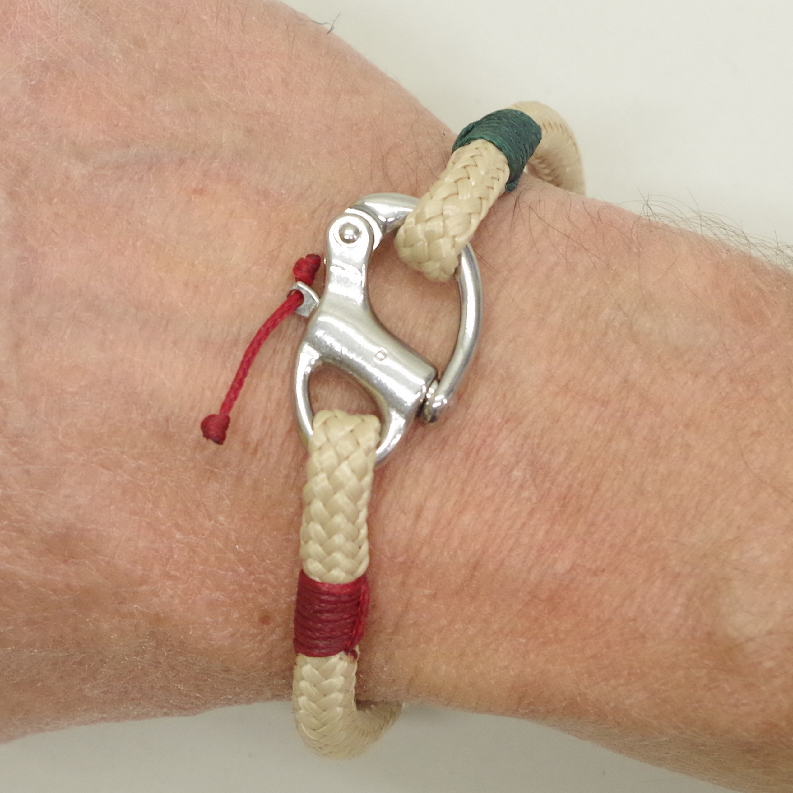 Bracelet en cordage marin avec véritable mousqueton de spi en inox, Surliures verte et rouge: babord tribord, Deux épissures surliées forment les boucles pour le passage du mousqueton, Bout diamètre 6 mm, Mousqueton de 34 mm à ouverture sous charge,