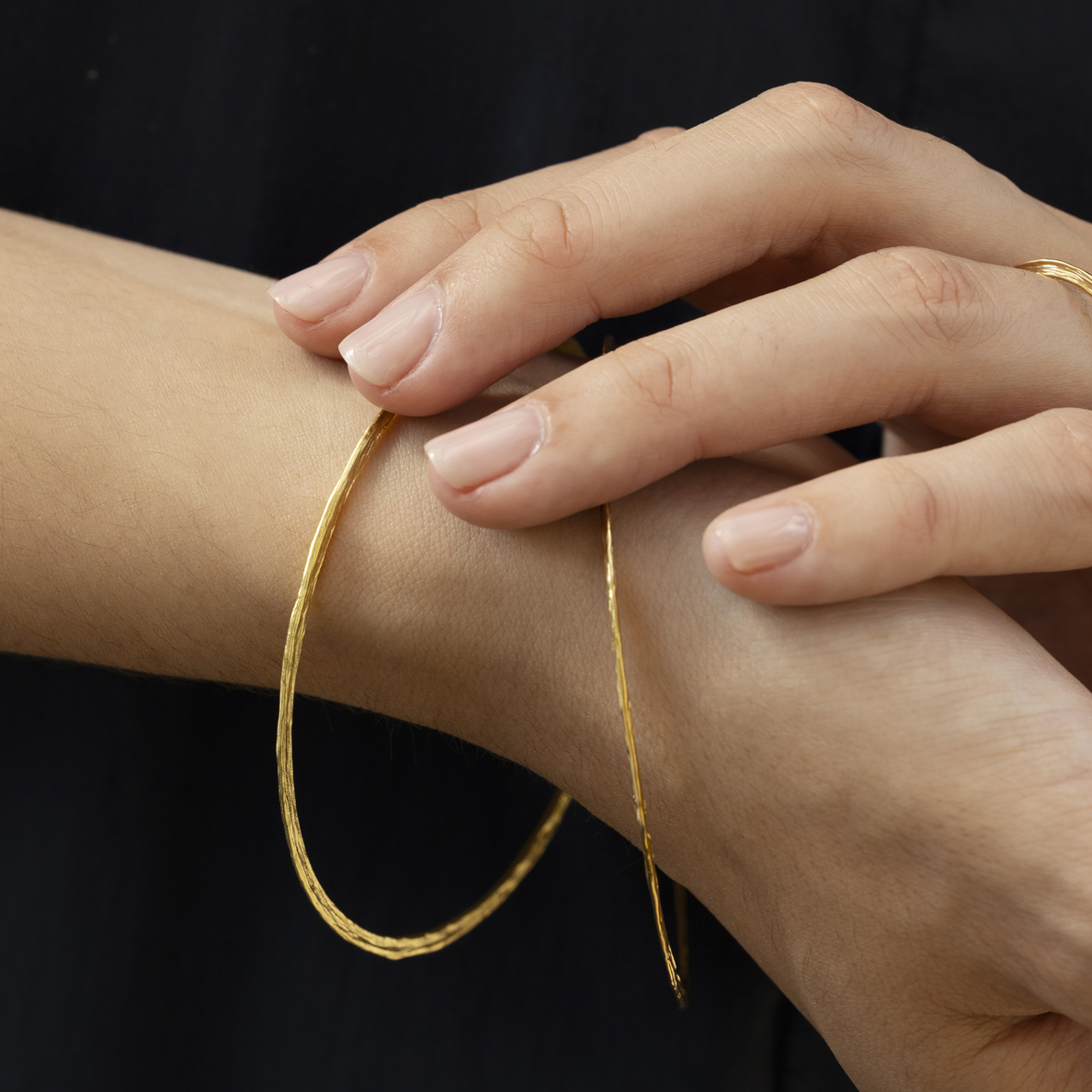 Bracelet jonc en or texturé, 750/1000 d’origine équitable certifié Fairmined. Fabriqué artisanalement dans l’atelier à Narbonne, ce bracelet propose un bijou au design contemporain et épuré.