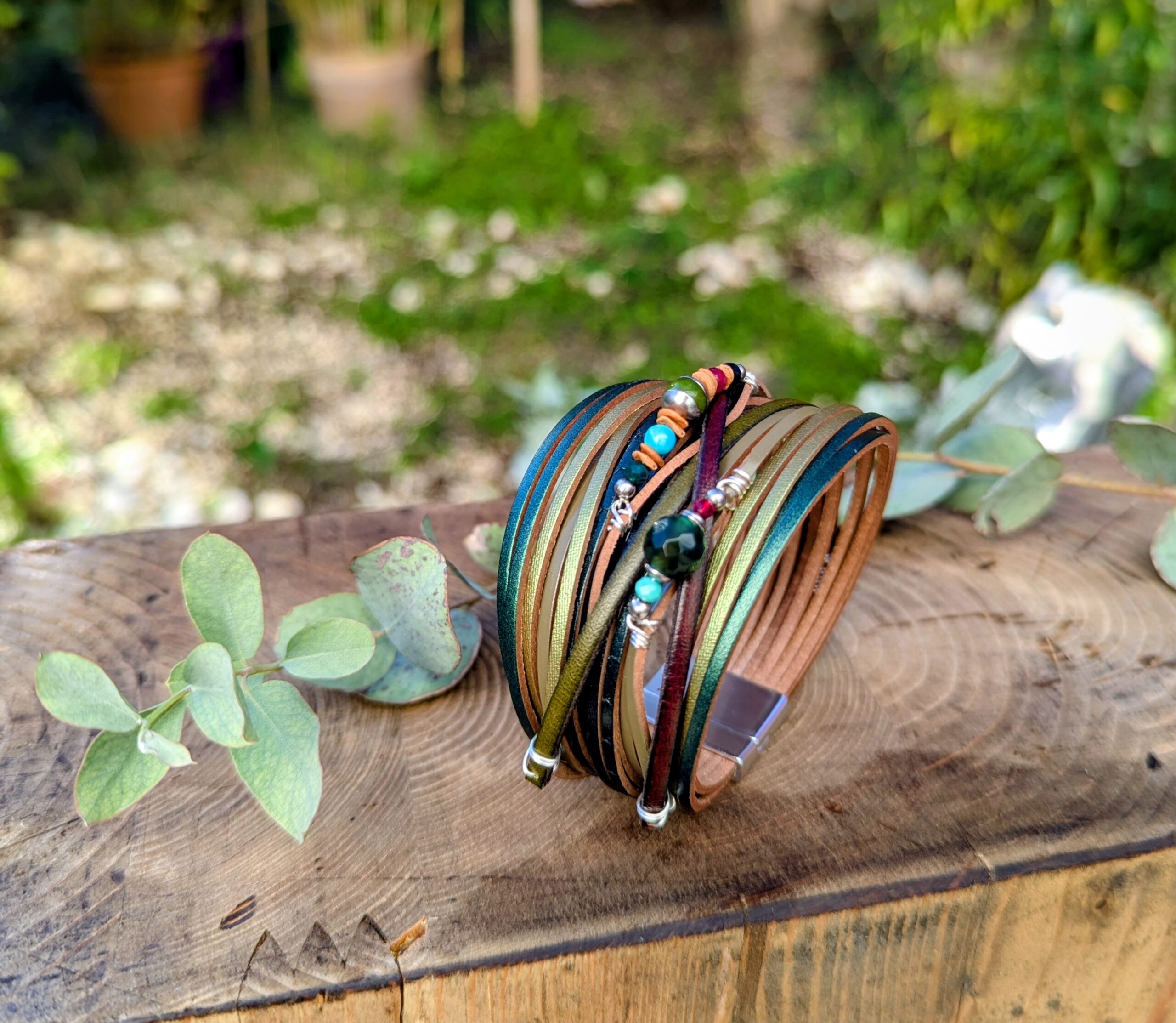 Bracelet manchette multi liens en cuir , pierres semi précieuses, nacre et écorces de bois