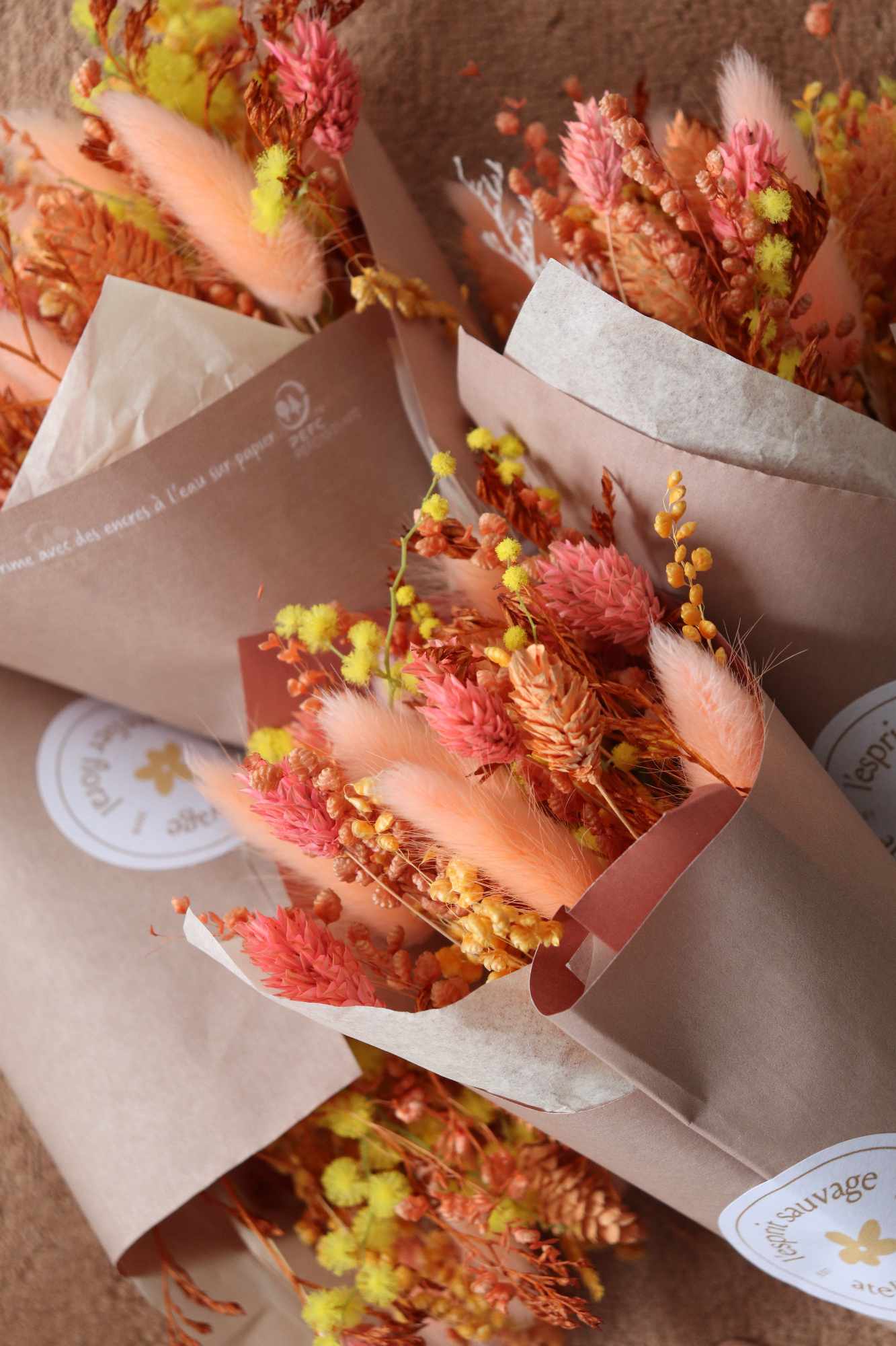 Les mini bouquets seront le cadeau idéal pour remercier vos convives lors d’un mariage, anniversaire, baptême ou toute autres événements. Chacun des bouquets sera minutieusement emballés individuellement. Les photos représentées sont des œuvres déjà réalisées, afin de vous donner une idée du rendu final, attention chaque bouquet est unique ! Les mini bouquets sont réalisés uniquement à la commande et avec le plus grand soin dans mon atelier à Toulouse. Dimensions : +/- environ 10cm Quantités : vendu à l’unité, par lot de 5 ou par lot de 10 pour plus de quantités me contacter par mail à contact.lespritsauvage@gmail.com ou via le formulaire de contact. Coloris image : pêche, corail, jaune, grenadine & orange