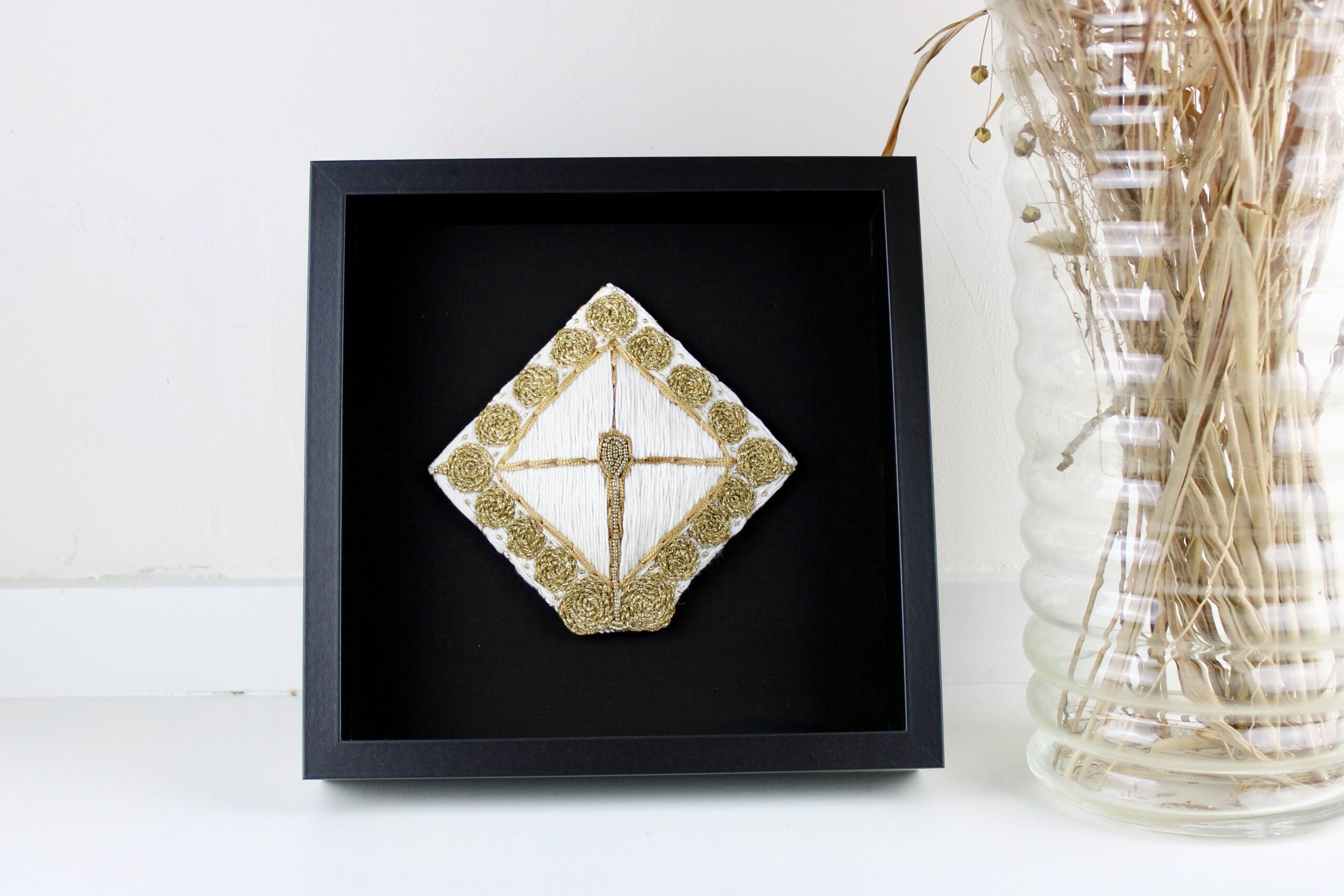 Broderie main sous cadre noir (27 x 27 cm) à poser ou à accrocher. Fil de coton écru, fil métallisé et perles dorées.