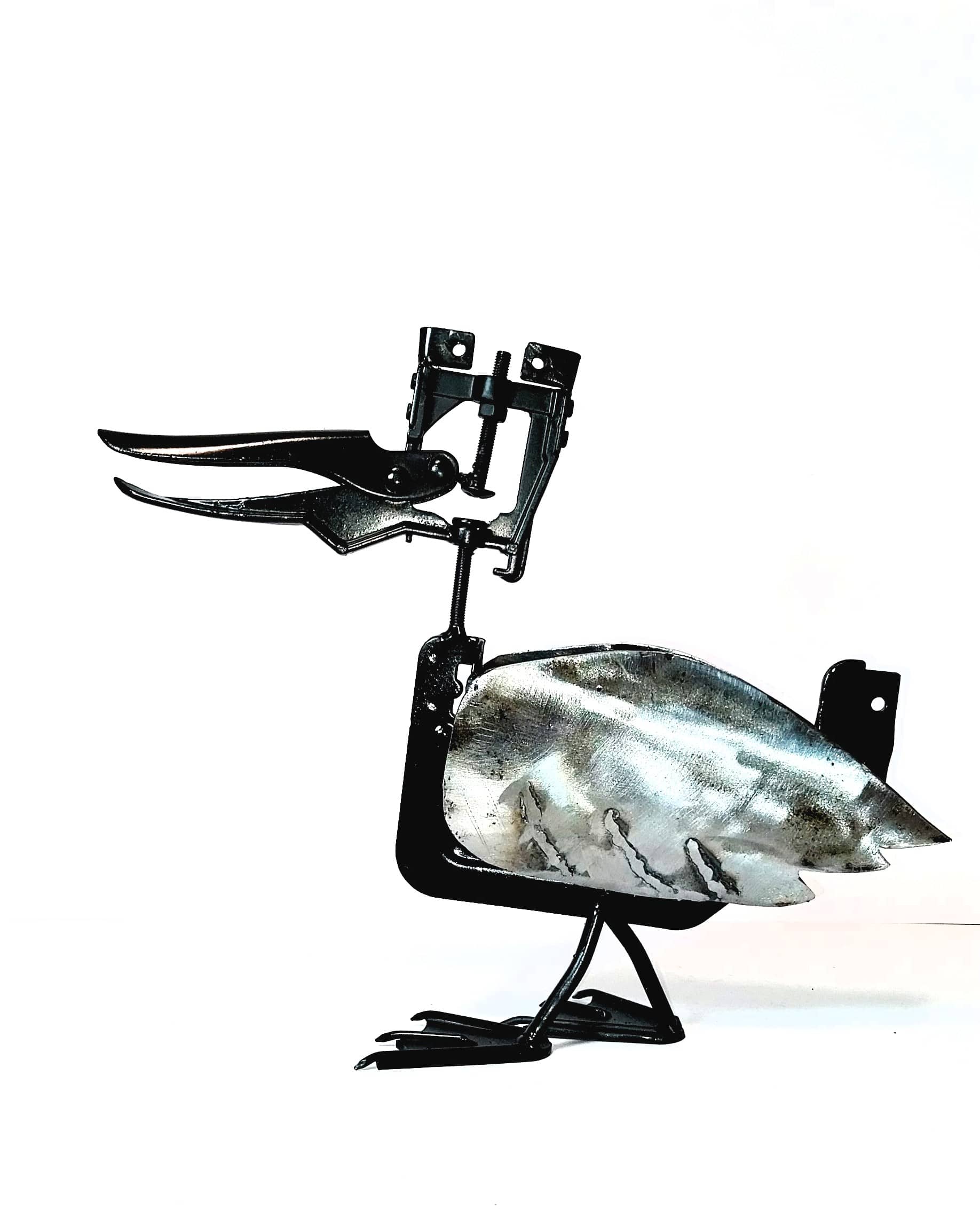 Le « Canard Vissé » – Création en Métal Upcyclé : L’humour s’invite dans votre déco avec ce détournement original ! Entièrement conçu à Ganges, ce canard de caractère est né de l’assemblage de pièces de récupération soudées à l’arc. Le design : Un serre-joint astucieusement détourné forme le corps, la tête et le bec. Les détails : Ailes et pattes en tôle découpée, griffes réalisées à partir de clous pour un rendu brut et authentique. Fabrication : Pièce unique et pleine d’esprit, 100% Occitanie.