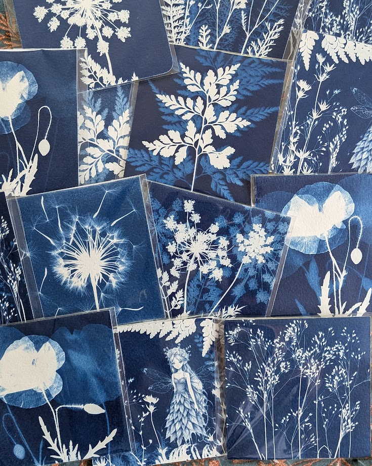 Cartes artisanales réalisées en cyanotype, un ancien procédé photographique utilisant la lumière du soleil pour révéler des empreintes végétales. Chaque carte est composée à la main à partir de plantes naturelles, rendant chaque pièce unique. À offrir, encadrer ou conserver comme un petit fragment de nature.