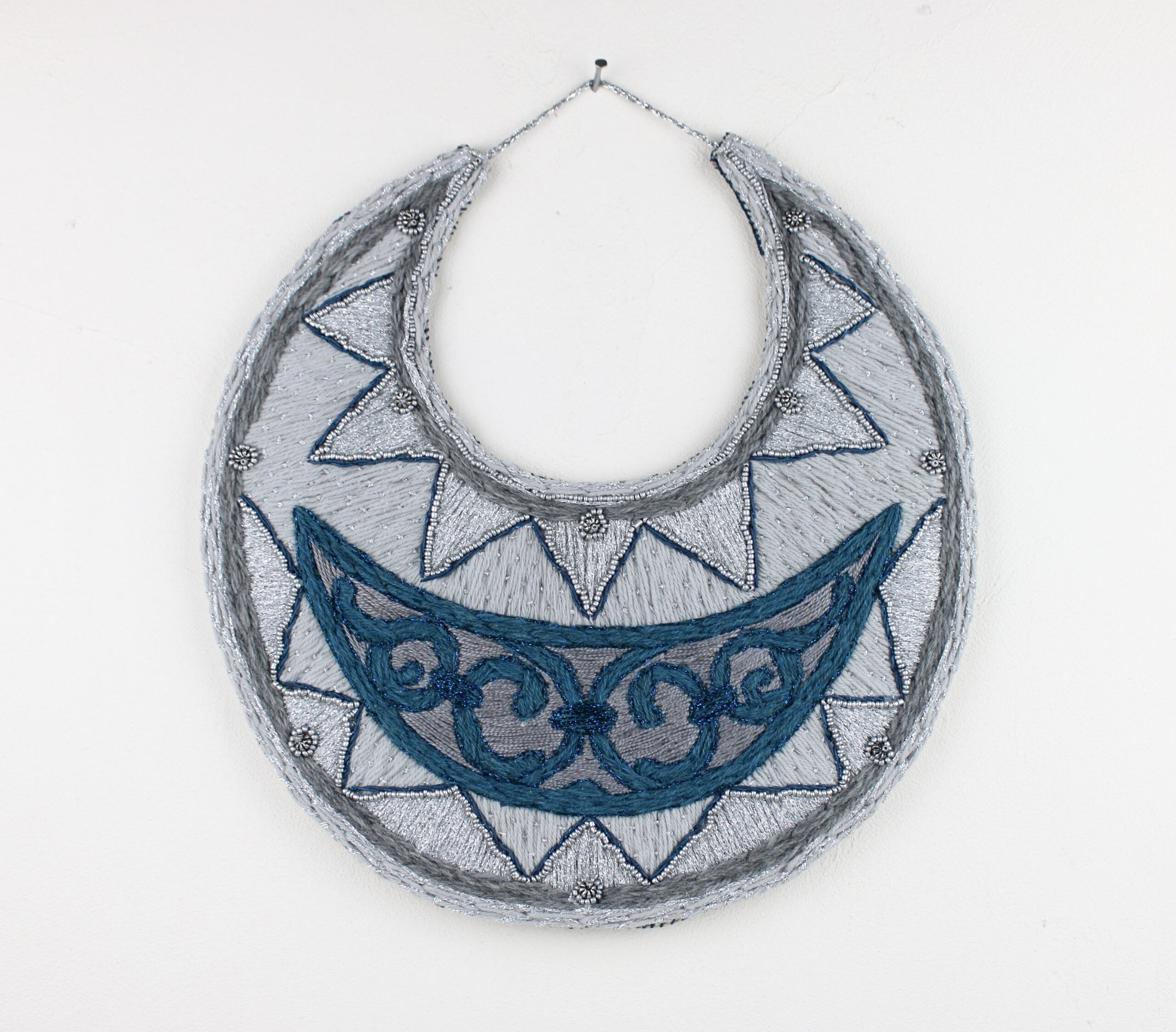 Inspiré d’un bijou du Daghestan, il était cousu aux robes de mariée. Il est brodé à la main avec des fils de laine, coton, fils métalliques argent, et bleu. Diamètre : 28cm