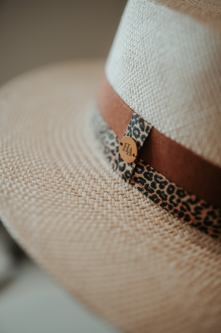 Chapeau de style « Canotier » en paille de toquilla « panama » tressé à la main en Colombie, couleur naturelle, moulé et cousu à la main à mon atelier en Aveyron, France. Calotte plate de 9,5 cm de haut et large bord bord plat et garni d’un ruban Gros-grain terracotta et d’un biais imprimé léopard.