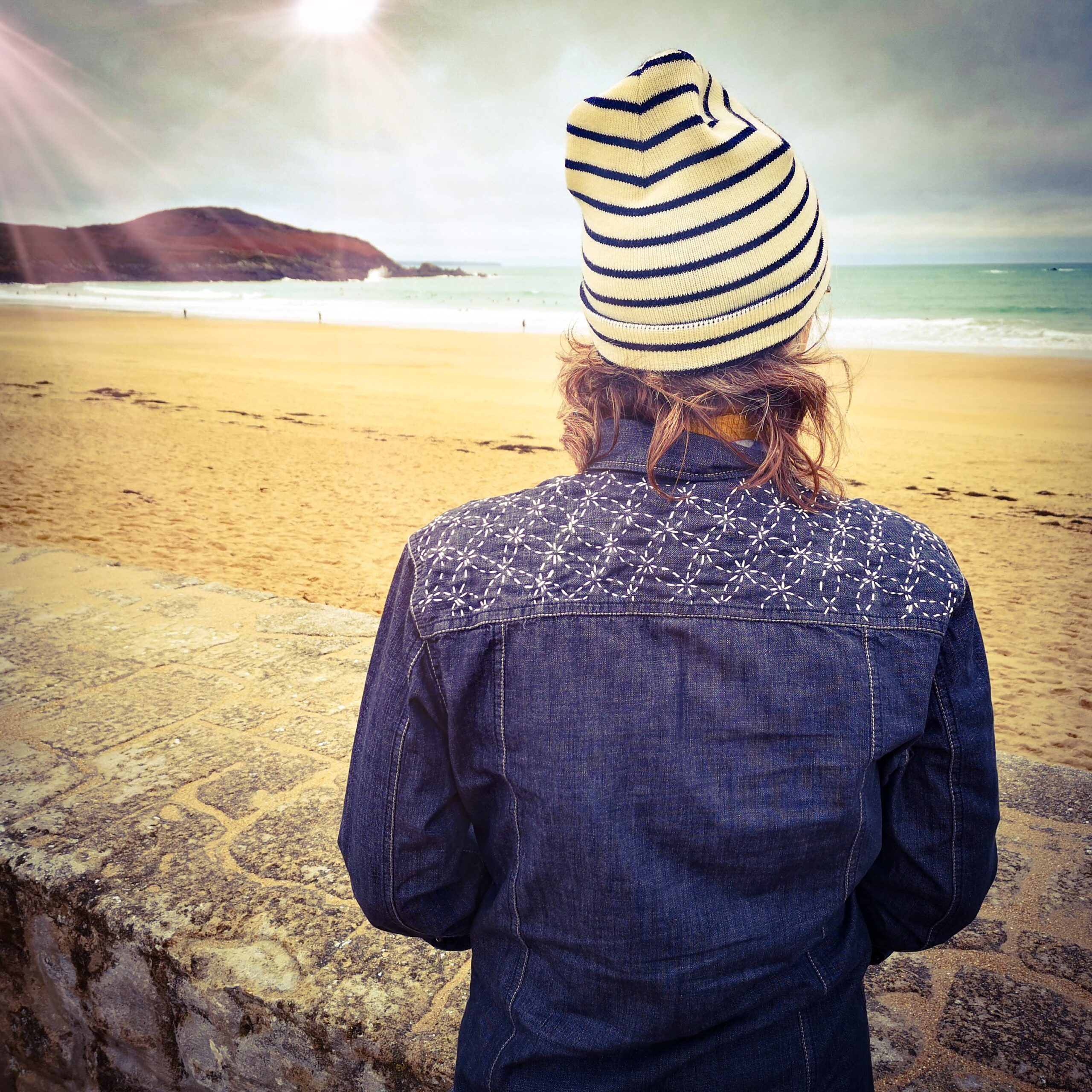 Chemise chinée en jean de belle qualité (marque ESPRIT) upcyclée par une broderie à la main sur l’empiècement dos et sur le côté (la vague). Technique : broderie japonaise Sashiko (10h de travail) Pièce Unique Taille = M ou 40 (femme)