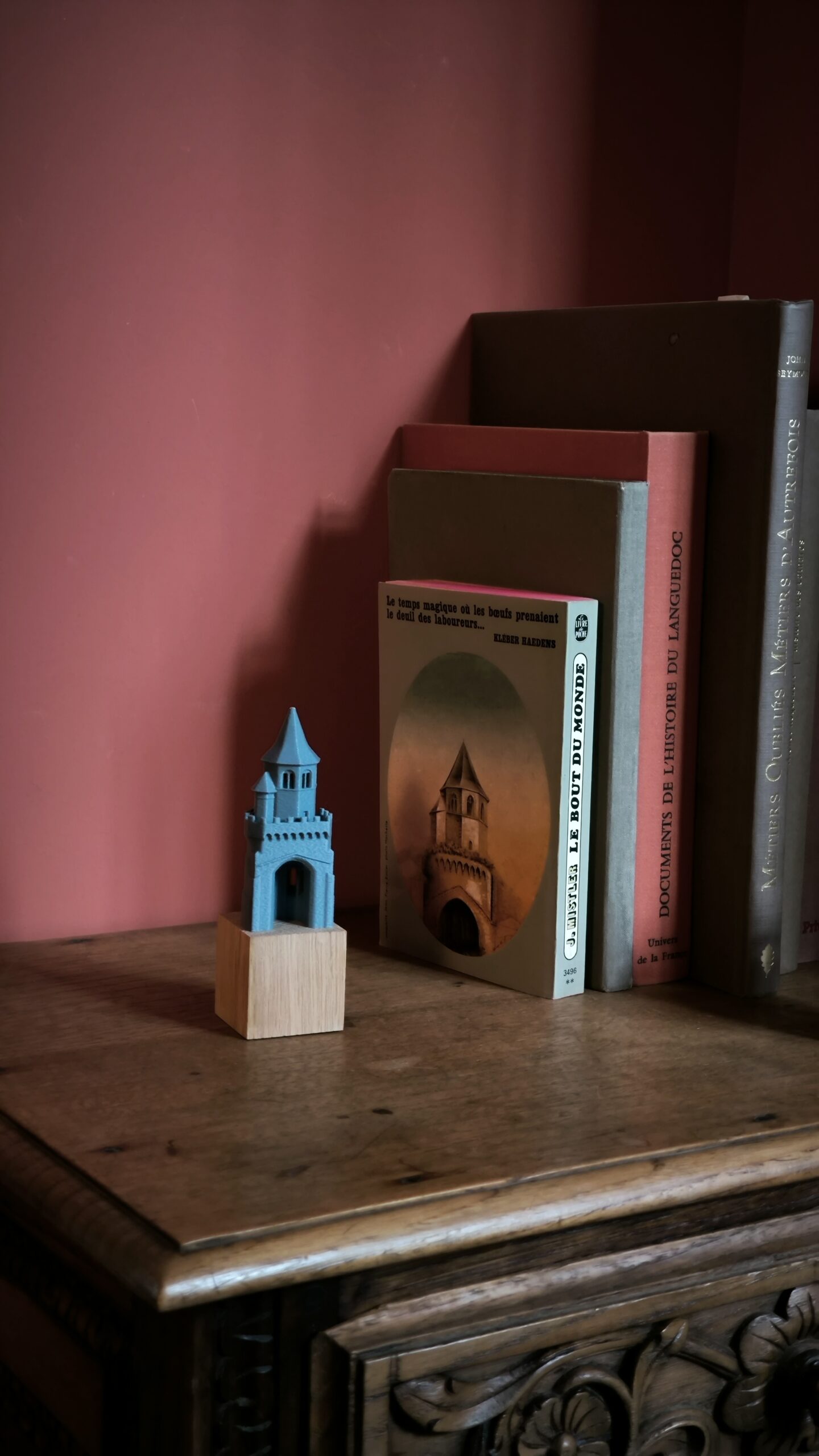 Clocher Saint Martin en miniature, 12 cm de haut. Impression 3D en bioplastique français sur socle en chêne massif. Un clin d’œil artisanal au patrimoine local.