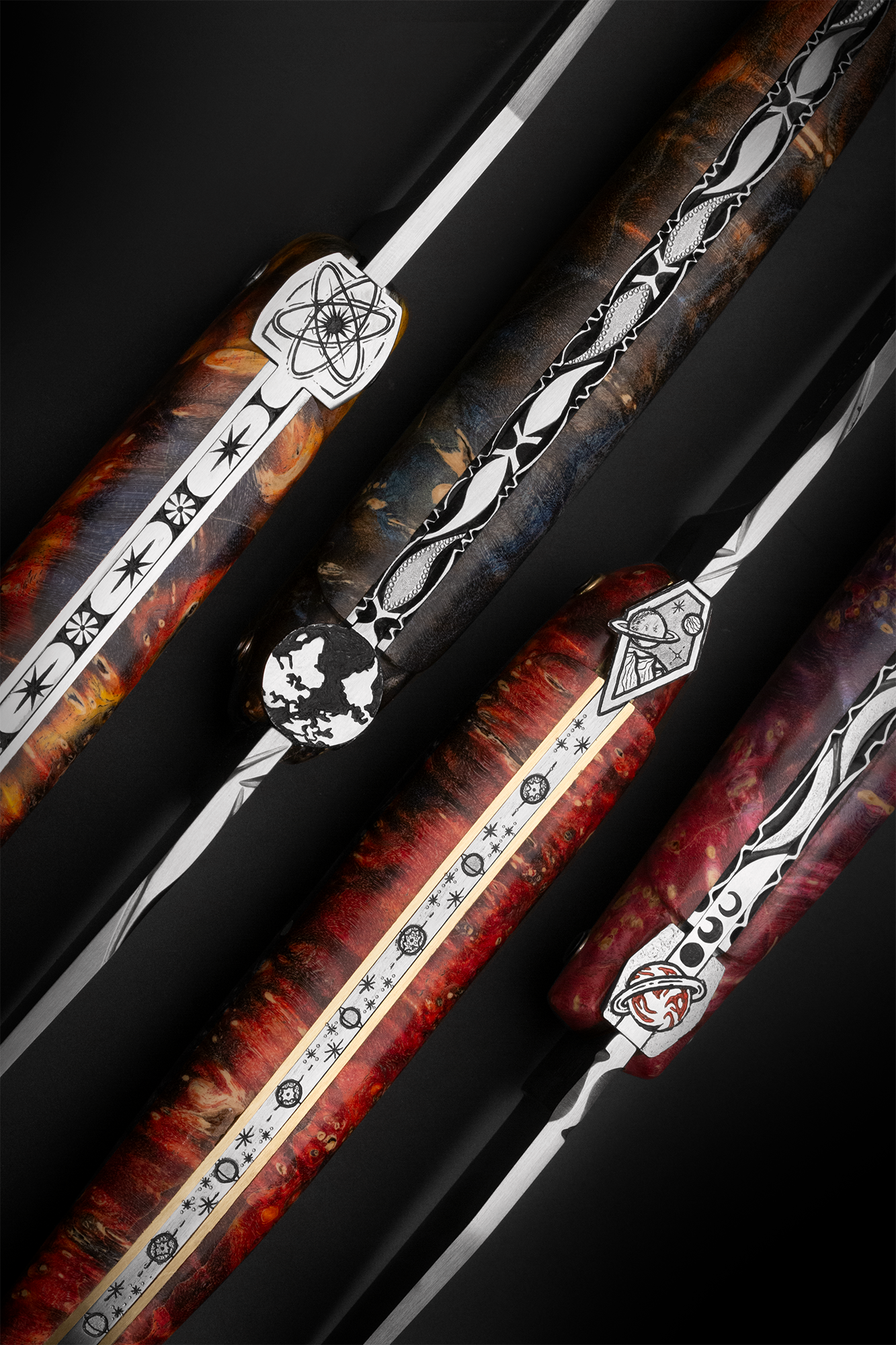 Chaque couteau arbore un manche façonné en loupe de sureau teintée, un bois précieux dont les motifs naturels, sublimés par des teintes profondes et vibrantes, évoquent les fascinants tourbillons de la Voie lactée. Ces variations de couleurs semblent capturer l’éclat des milliards d’étoiles qui scintillent dans notre galaxie, offrant ainsi une esthétique unique et envoutante. Chaque modèle est doté d’une mouche personnalisée pour représenter l’un des grands éléments de l’univers : – Le Big Bang, symbole de la naissance de l’espace et du temps – La Terre, notre précieuse planète bleue – L’espace, mystérieux et fascinant – Saturne, majestueuse avec ses anneaux emblématiques Afin de parfaire cette ode à l’univers, le ressort de chaque couteau est orné d’un décor finement gravé ou guilloché, reprenant des motifs célestes en harmonie avec le thème spatial.