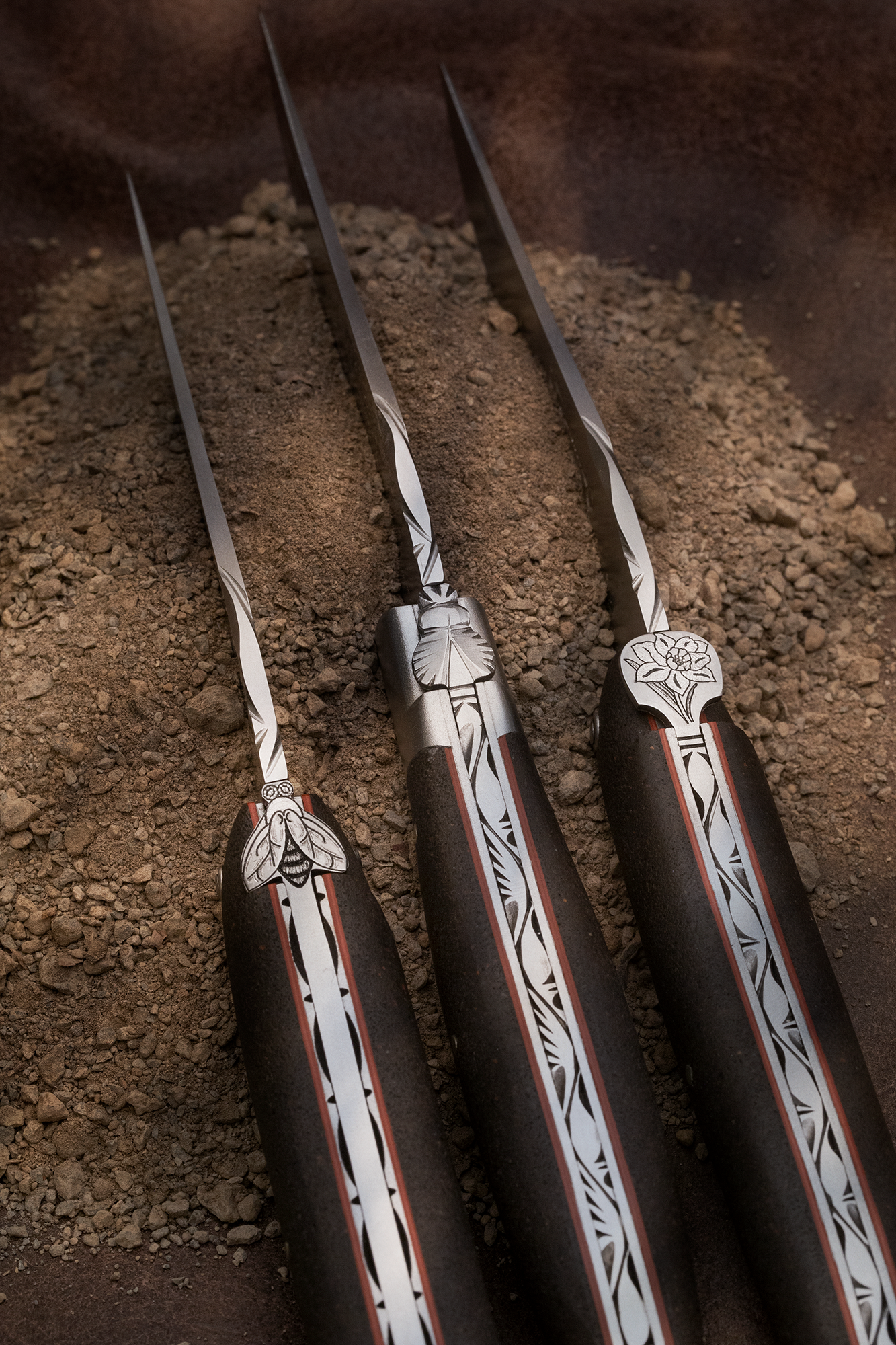 La collection Terre d’Aubrac incarne l’identité de ce haut plateau emblématique. Chaque couteau pliant est façonné à partir de véritable terre de l’Aubrac, transformée et sublimée pour donner naissance à des manches au caractère brut et authentique. Au toucher, la texture de cette nouvelle matière surprend. Elle est légèrement rugueuse, presque minérale évoquant la puissance de ses paysages préservés. À l’œil, elle séduit par sa profondeur : une teinte sombre, presque noire ponctuée de grains plus clairs et rougeoyants, rappelant les feux volcaniques et la richesse du sol. Plus qu’un couteau, c’est un fragment d’Aubrac que l’on emporte avec soi. Chaque pièce raconte l’histoire de cette terre, de ses traditions et de sa nature indomptable.