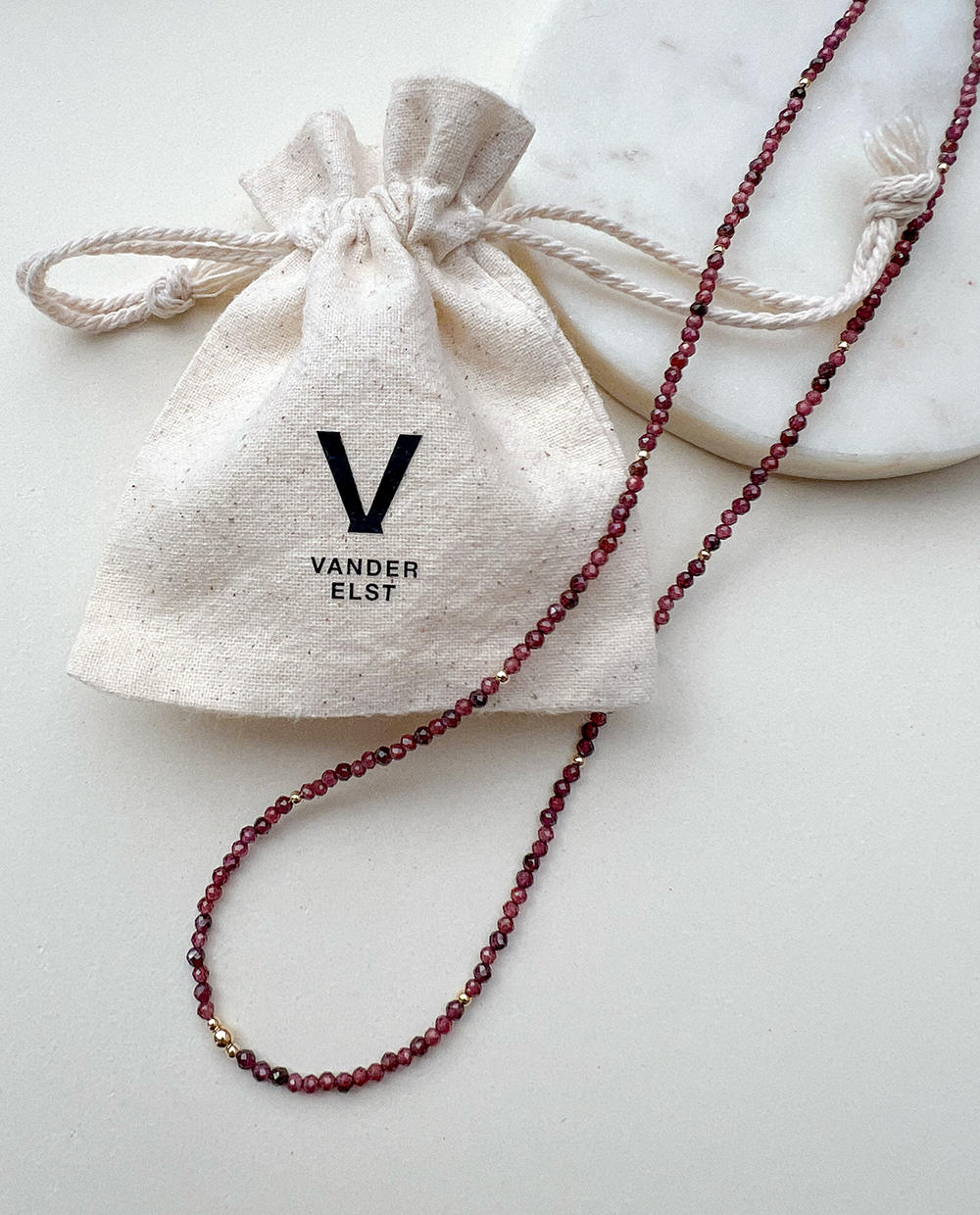 Collier ras de cou fin en pierre naturelle de grenat, délicatement rehaussé de petites perles dorées lisses, une perle dorée plus grosse au centre du collier. Un bijou simple, intemporel et élégant. Les perles sont facettées (2mm de diamètre) elles scintillent beaucoup à la lumière ! Le fermoir et les perles dorées sont en qualité « gold filled » : une couche d’or laminé 14K plus épaisse que pour la simple finition « plaqué or ». Ce bijou est précieux : il est conçu pour durer et briller longtemps ! Collier monté sur fil câblé souple et solide.