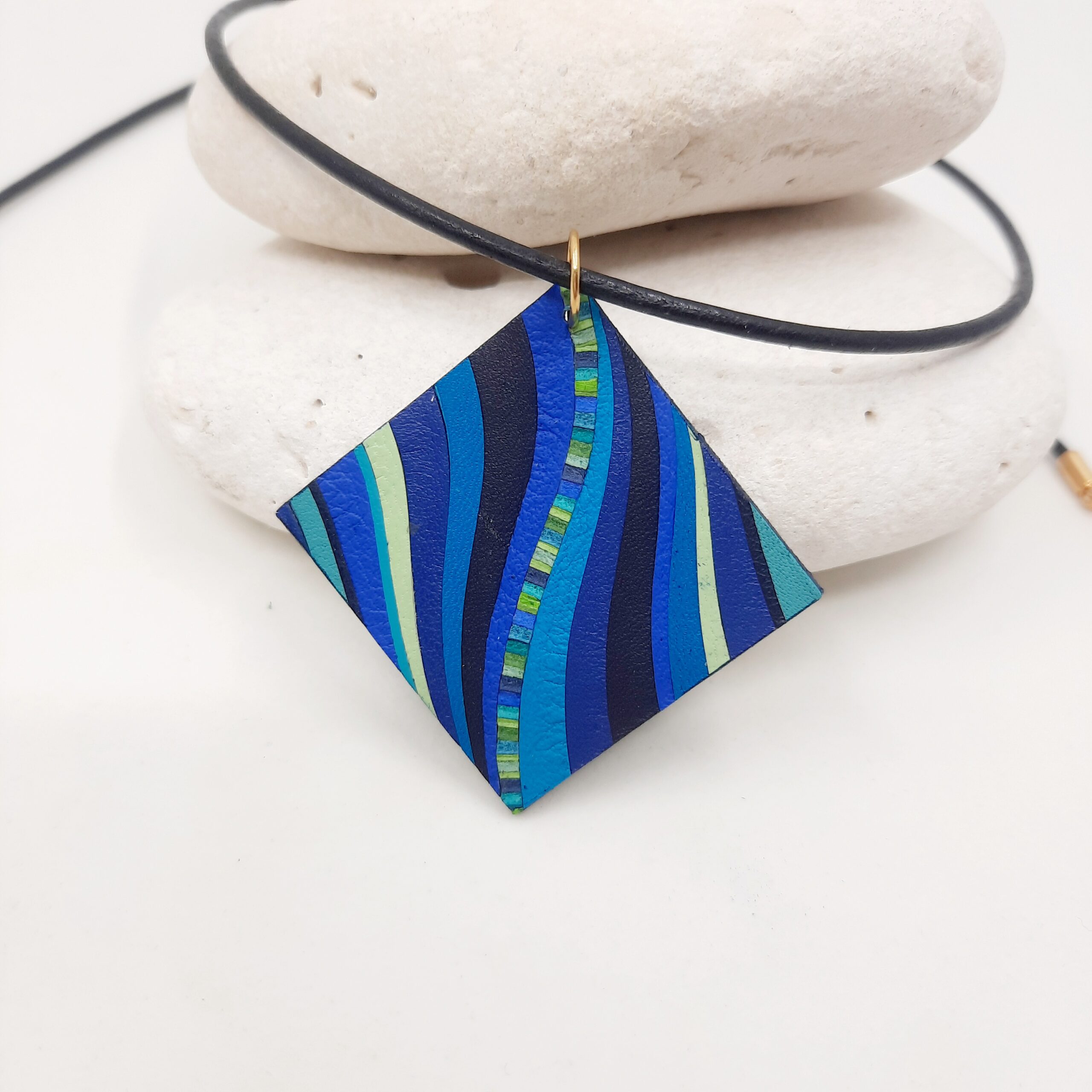Confectionné par juxtaposition de morceaux de cuir sélectionnées, le pendentif en marqueterie est contrecollé sur du cuir. Il est monté sur un lacet de cuir rond fermé par un mousqueton sur une chaînette de rallonge. Pendentif 3,5 cm x 3,5 cm Longueur du lacet tour de cour 45 cm Chaînette de rallonge 5 cm