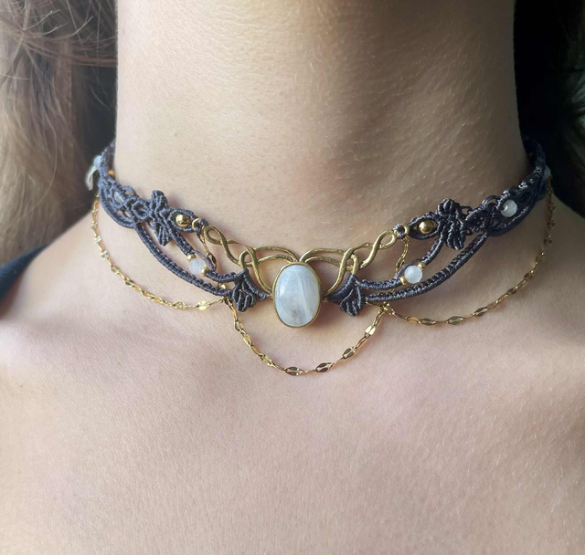 Ras de cou tissée à main en France avec la technique du micro macramé. Le fil utilisé est un fil plat de 0,75mm noir bleuté , réputé pour sa grande solidité il assurera longue vie à votre bijou. La breloque centrale est en laiton doré avec en son centre un cabochon de pierre de lune blanche aux reflets bleutés. Les chaines et perles de finitions sont en acier inoxydable. Des petites pierres facettées de pierre de lune de 4mm sont intégrées dans le tissage. Ce bijou peut également être porté en bijou de tête. La longueur est ajustable grâce à sa fermeture coulissante tissée . Dimensions : Longueur : de 31 cms à 76 cms , Largeur : 2,5 cms , Poids : 10g Disponible en finition dorée ou argentée et dans plusieurs coloris