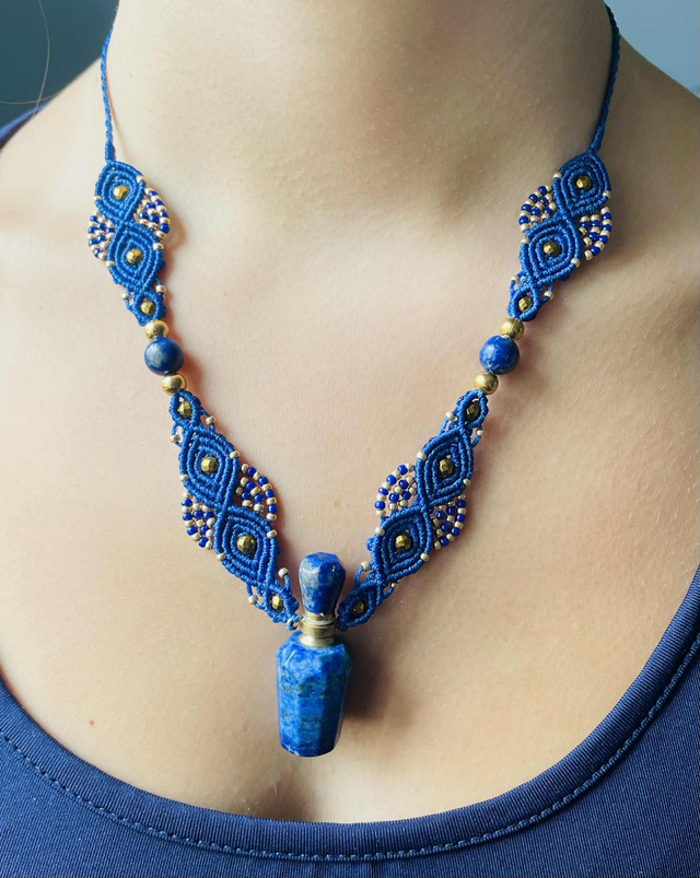 Collier tissé à la main , dans mon atelier du sud de la France avec la technique du micro macramé . La fiole est en lapis lazuli et s’ouvre afin de recevoir du parfum , une huile essentielle , … Le fil utilisé est un fil plat de 0,8 mm bleu électrique, réputé pour sa grande solidité il garantira longue vie à votre bijou. Dans le tissage , on retrouve des perles de lapis lazuli , des perles de rocailles miyuki dorée duracoat et bleue électrique ainsi que des perles en acier inoxydable doré. La longueur du collier est ajustable grâce à sa fermeture coulissante tissée , lui permettant de s’adapter à toutes les morphologies. Dimensions : Longueur totale : 111cms , Poids : 21 g.