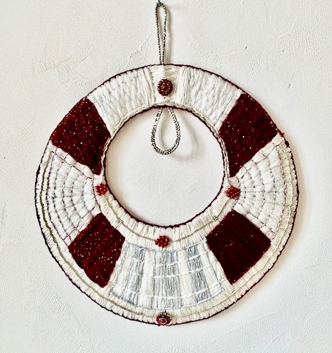 Collier brodé main avec des laines blanc cassé et rouge grenat, fil d’Ecosse écru, fil argenté. Diverses perles 29 cm de diamètre
