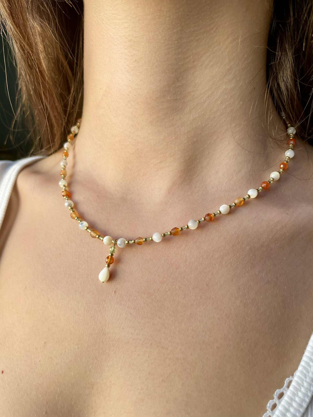 Collier de perles de nacre et pierres naturelles . Monté sur fil câblé , les apprêts utilisés sont en acier inoxydable , les perles de finitions sont des perles de rocailles miyuki doré duracoat ( placage de qualité pour une durée de tenue plus longue) et des perles en acier inoxydable dorées. Plusieurs modèles disponibles . Dimensions : Longueur : de 45 cms à 50 cms grâce à sa chainette d’extension . Poids : 3 g. Disponible en finition dorée ou argentée avec diverses pierres naturelles