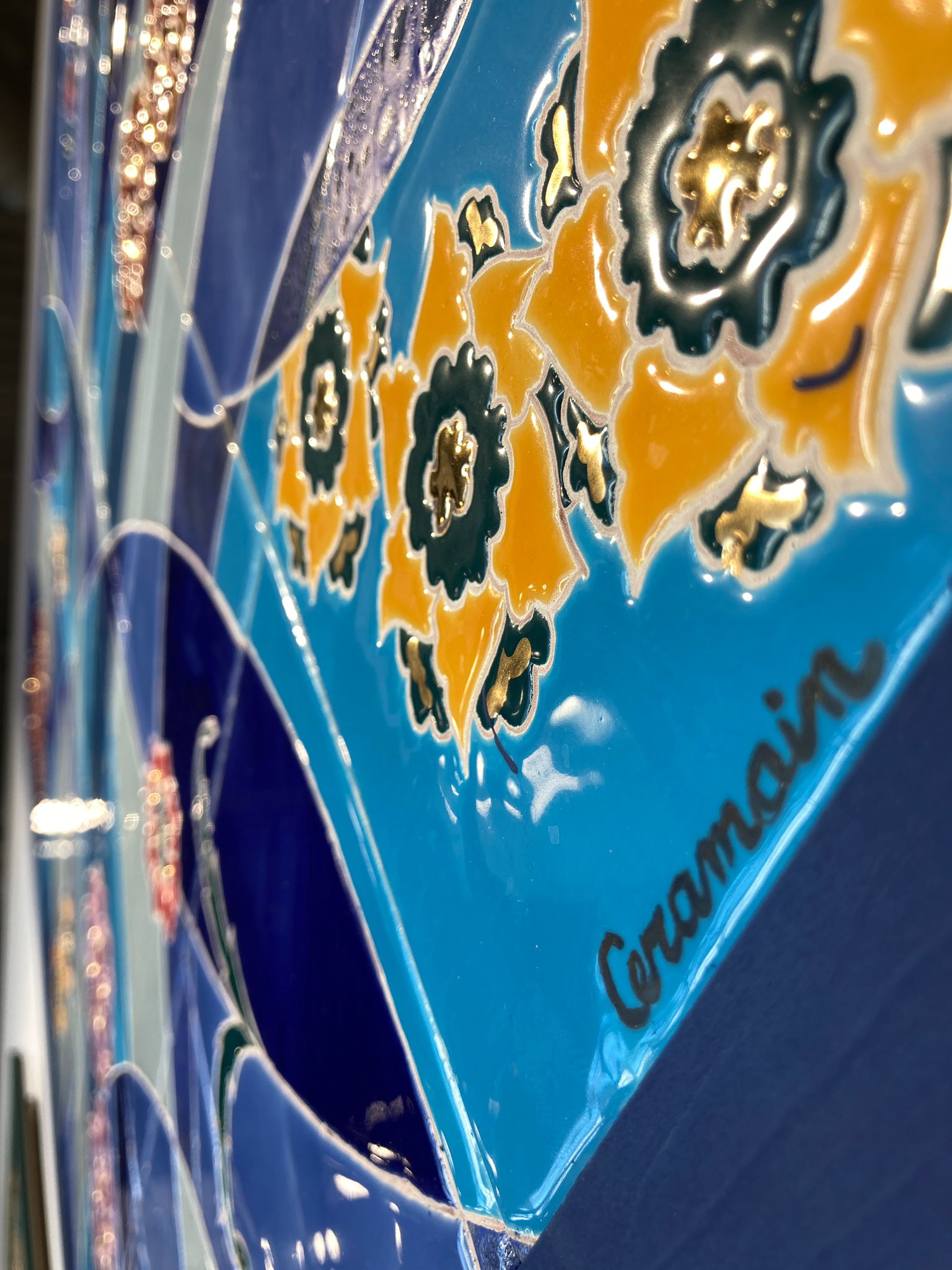 La fresque murale florale « Cosmos » est en carreaux de céramique artisanaux inspirés des émaux de Longwy. Technique du cerne émail, décoré d’or 18 carats. Présentation élégante sur un tableau en bois.