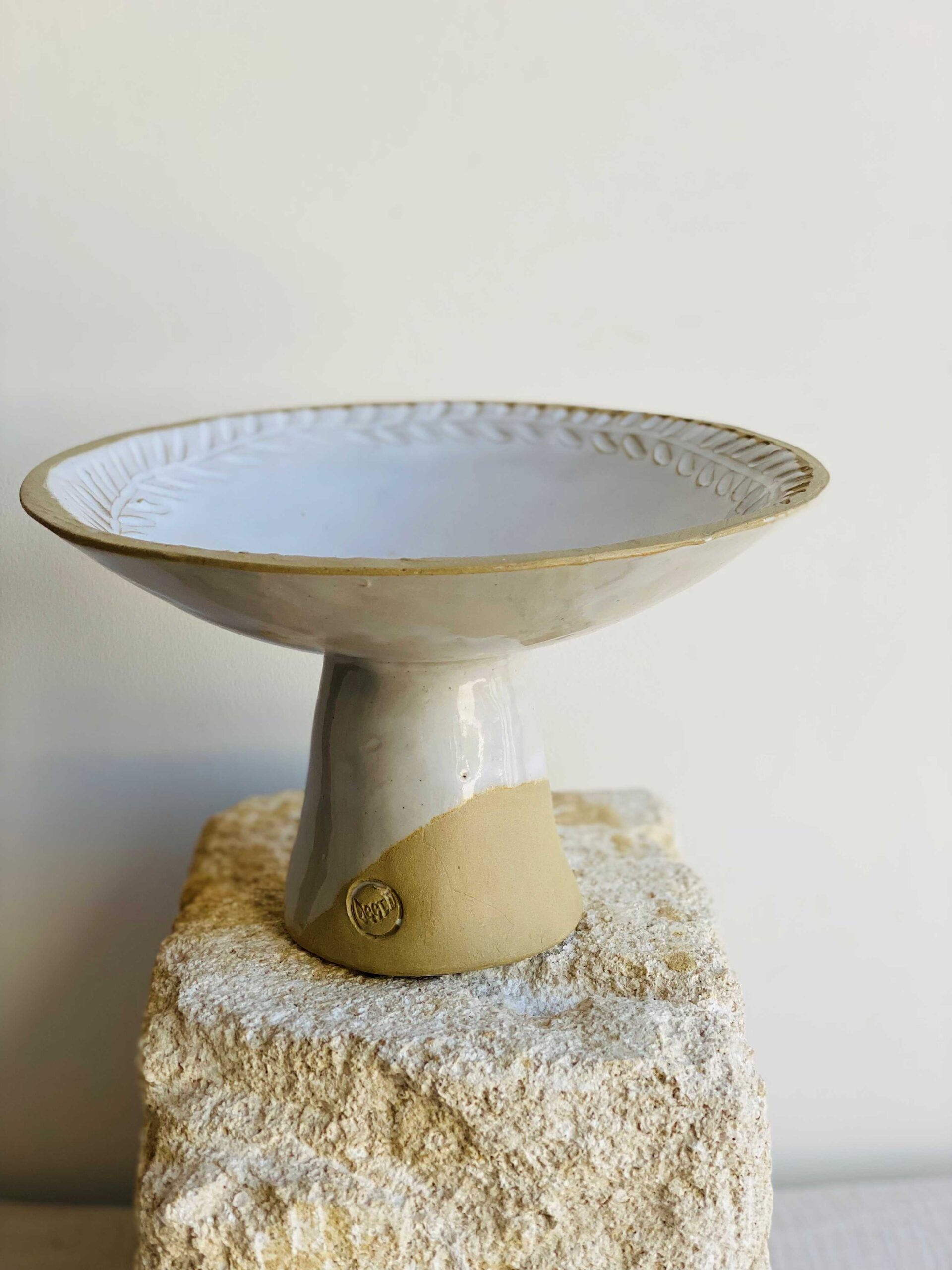 Coupelle de présentation décorative. Coupelle réalisée en grés, texturée et émaillée partiellement en blanc brillant.