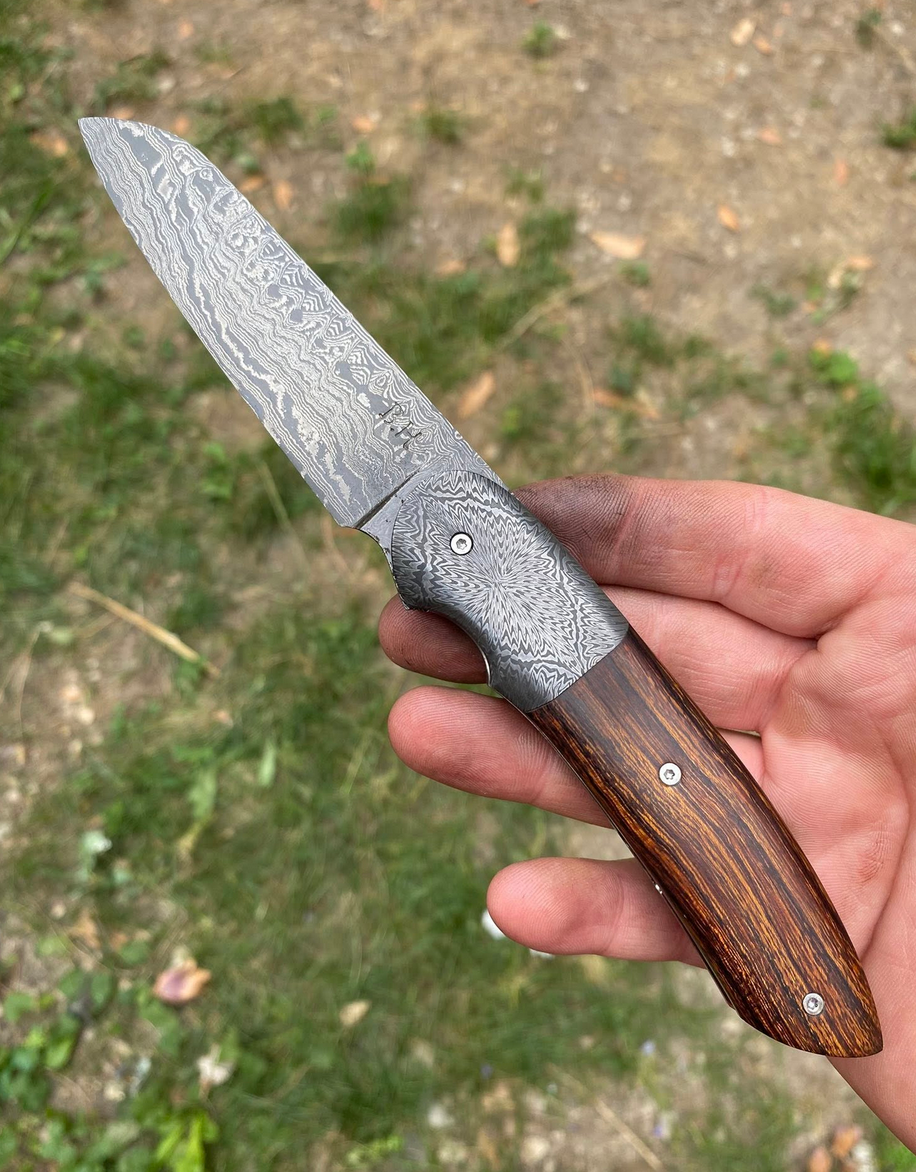 Voici plusieurs exemple de couteau pliant que je fabrique entièrement. Je fabrique moi même mes propre acier damas, j’utilise tout type de matière pour les manches ( bois, carbone, mammouth…) Pour les lames, il y a plusieurs choix possible , acier carbone ; inoxydable , damas maison
