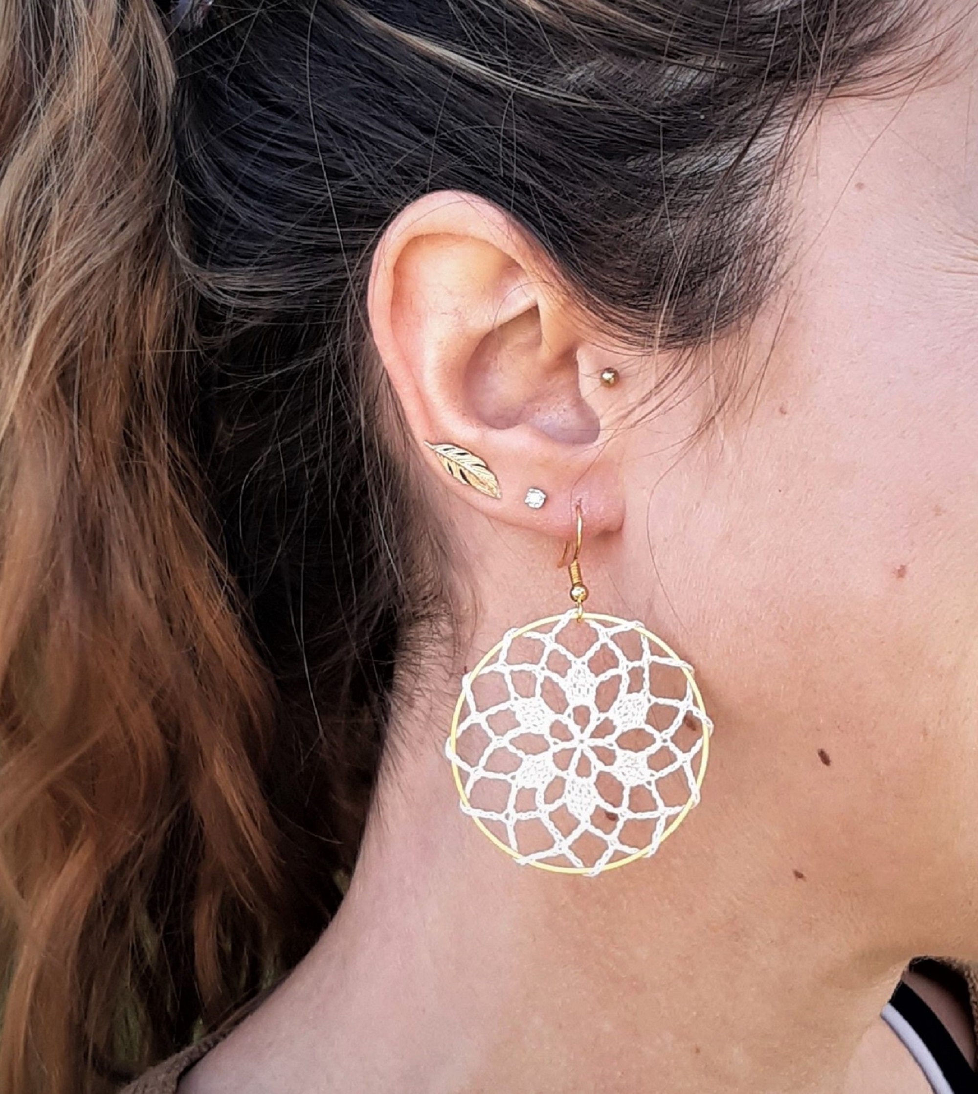 Boucles d’oreilles réalisées au crochet. Crochets d’oreilles et anneaux en acier inoxydable doré. Très légères, très confortables à porter toute la journée. Disponibles en plusieurs tailles et couleurs, elles s’adaptent à tous les styles et toutes les occasions !