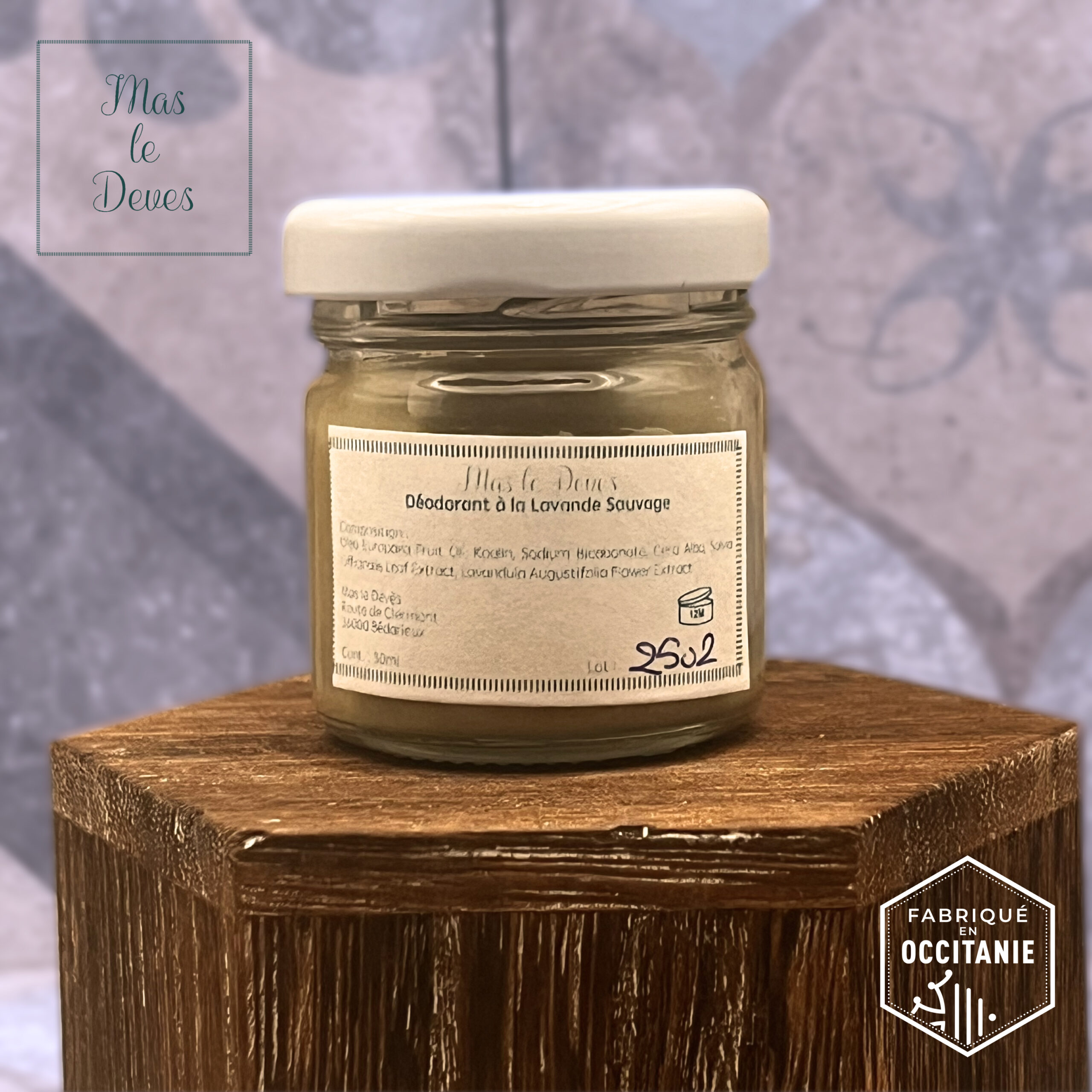 Déodorant artisanal fabriqué à la main au cœur du Parc naturel régional du Haut-Languedoc. Il est formulé à partir de lavande sauvage cueillie sur place, associée à de l’huile d’olive biologique, de la cire d’abeille biologique, du bicarbonate de soude et de l’argile blanche. Sans colorant ni conservateur, ce déodorant convient à un usage quotidien. La lavande sauvage est appréciée pour ses propriétés purifiantes et rééquilibrantes, apportant une sensation de fraîcheur naturelle. Le bicarbonate aide à neutraliser les odeurs, tandis que l’argile blanche absorbe l’excès d’humidité en douceur. Très concentré : un grain de riz par aisselle suffit. ⚠️ Peut ne pas convenir aux peaux très sensibles (présence de bicarbonate). Fabrication locale, artisanale et engagée.