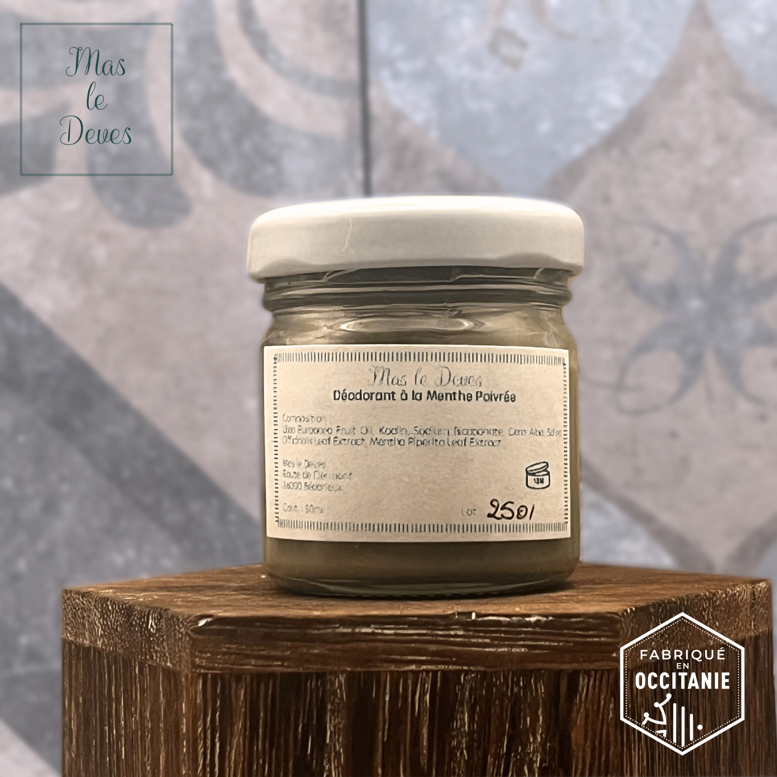 Déodorant artisanal fabriqué à la main au cœur du Parc naturel régional du Haut-Languedoc. Il est formulé à partir de menthe poivrée et de sauge officinale cueillies sur place, associées à de l’huile d’olive biologique, de la cire d’abeille biologique, du bicarbonate de soude et de l’argile blanche. Sans colorant ni conservateur, ce déodorant convient à un usage quotidien. La sauge officinale est appréciée pour aider à réguler la sensation d’humidité, tandis que la menthe poivrée apporte une sensation de fraîcheur naturelle. Le bicarbonate aide à neutraliser les odeurs et l’argile blanche absorbe l’excès d’humidité. Très concentré : un grain de riz par aisselle suffit. ⚠️ Peut ne pas convenir aux peaux très sensibles (présence d