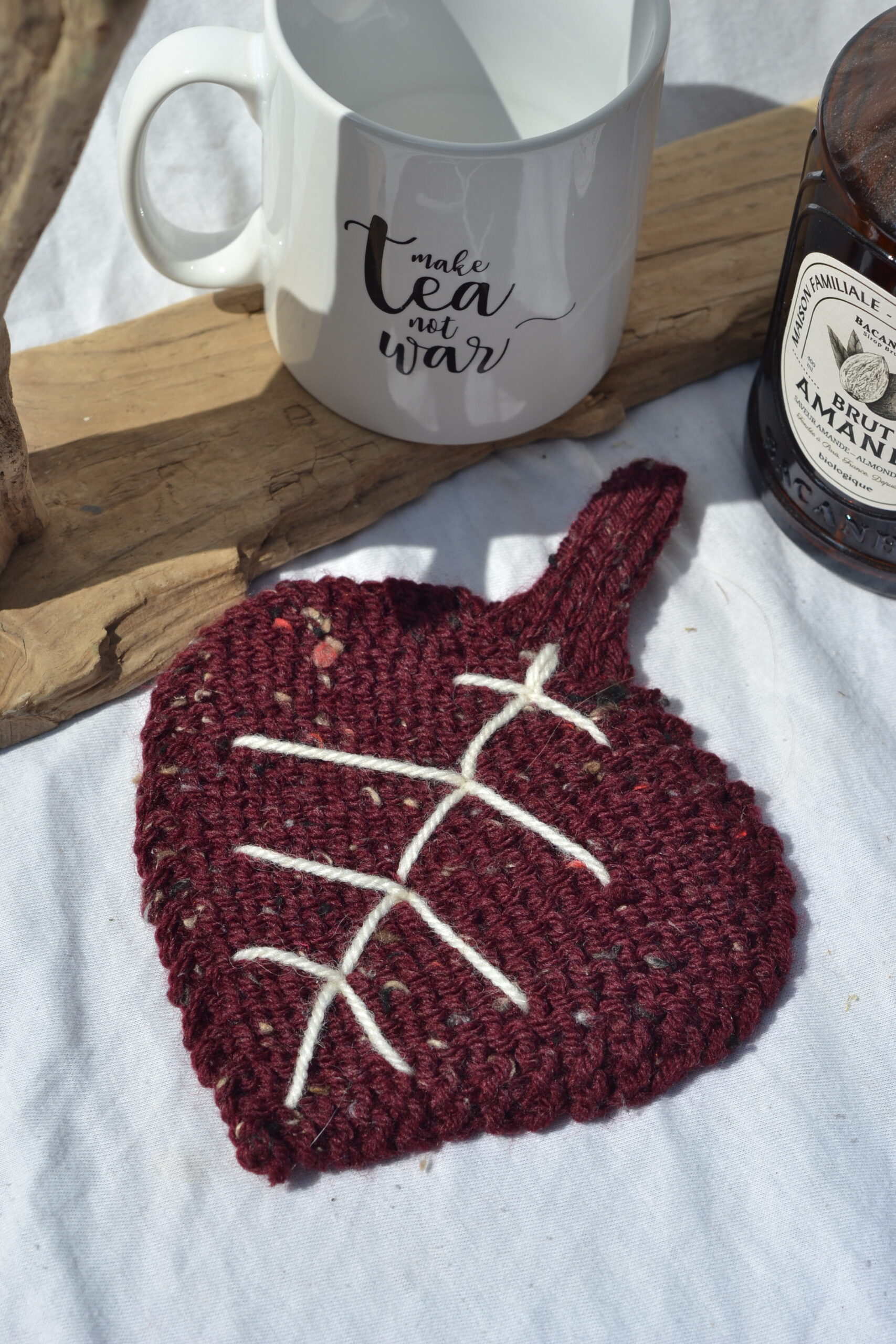 tricotée à la main au point mousse, nervures brodées à la main également, cette feuille permet de poser son mug ou sa tasse. Elle peut aussi être une décoration adaptée pour les saisons de l’automne ou de l’hiver, pour être intégrée à un centre de table … etc. Lavable en machine à 30°. Attention, chaque feuille est unique et il peut donc y avoir quelques légères différences entre la photo et votre exemplaire. Hauteur totale : 18cm – Largeur max : 14cm