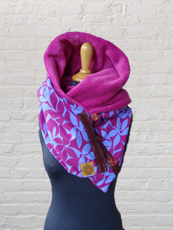 Écharpe-capuche large et douillette. Sweat à motif feuilles bleues et Prunes doublé de fausse fourrure rose chaude et moelleuse à l’intérieur. Un côté long à enrouler autours du cou et l’autre court pour venir fermer ce gros snood grâce à trois gros boutons cousus sur une patte en simili-cuir. Capuche sur l’arrière.
