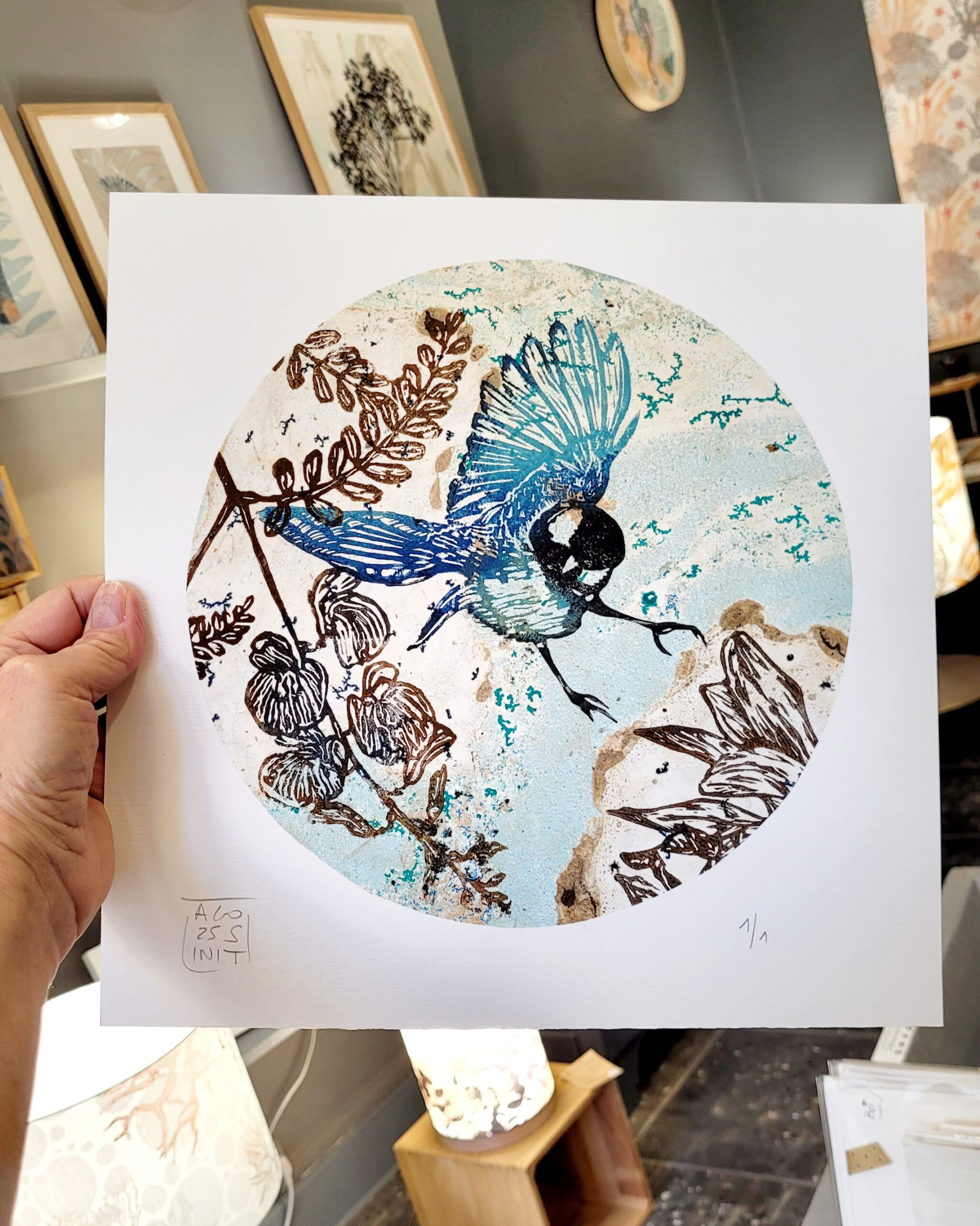 Installée au cœur de la ville de Sète, en Occitanie, mon entreprise est un atelier d’art où je conçois et réalise des œuvres décoratives originales, entièrement fabriquées à la main. Artiste graveuse, je crée des estampes, luminaires et kakémonos en associant des techniques artisanales de gravure en taille d’épargne et d’impression manuelle, sans presse, ainsi que des fonds réalisés à partir d’encres flottantes selon la technique japonaise du suminagashi. Chaque création est pensée, gravée, imprimée et assemblée dans mon atelier, en séries très limitées ou sur commande, avec une attention particulière portée au geste, aux matières et à la durabilité. Mon travail s’inscrit dans une démarche artisanale et artistique locale, valorisant le savoir-faire, le fait main et la création contemporaine en Occitanie.