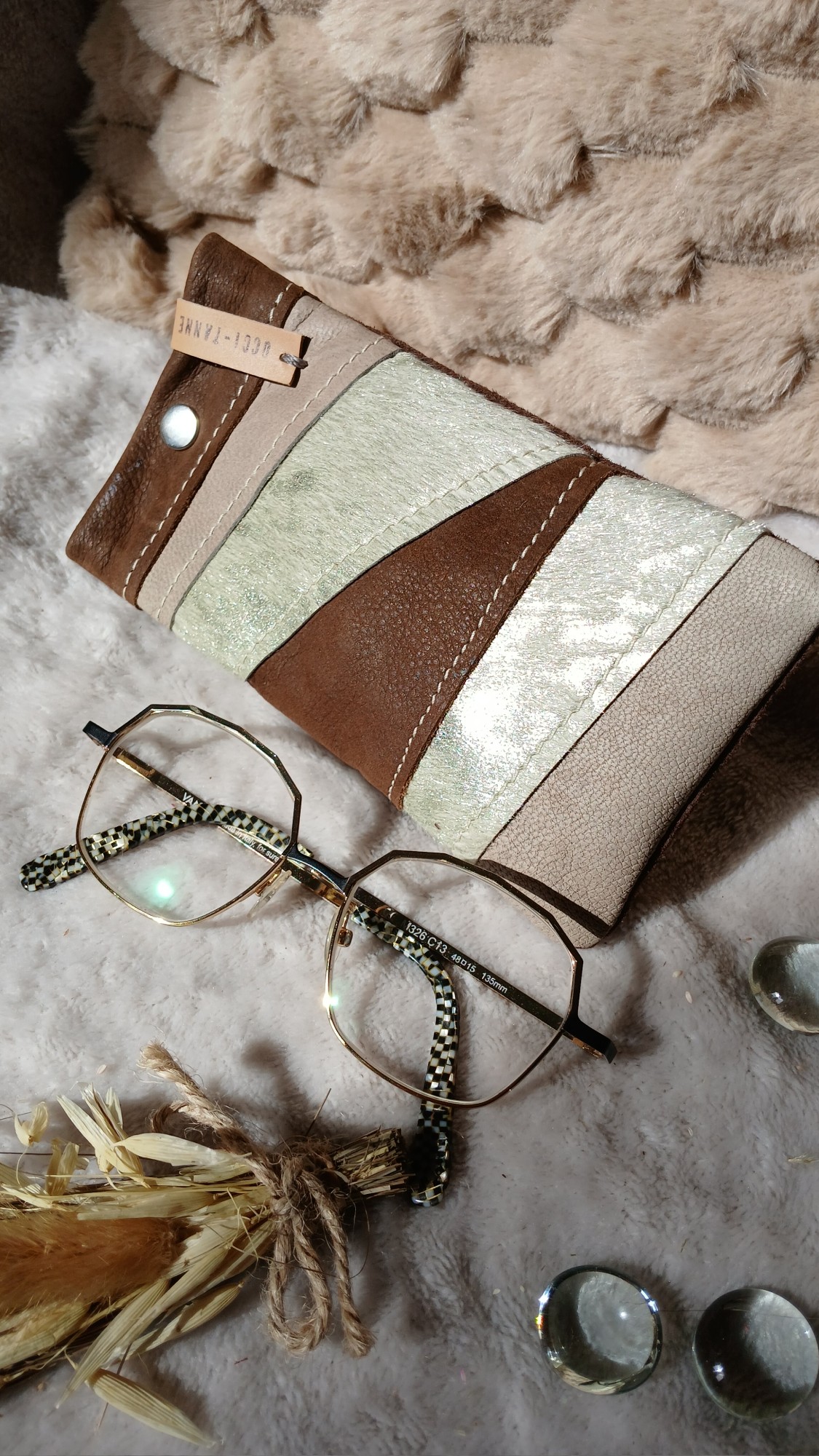 L’étui à lunettes « Apache » en cuir surcyclé combine l’authenticité et l’élégance de cuirs soigneusement sélectionnés. Sur la face avant, un cuir marron, doux et légèrement duveteux, se marie parfaitement avec un cuir mastic clair et lisse, tandis qu’un cuir argenté à poils apporte une touche lumineuse et raffinée. L’arrière présente un cuir marron upcyclé, au toucher velouté, créant un contraste subtilement sauvage, mais toujours élégant. La fermeture se fait par un bouton-pression pratique et sécurisé, alliant style et fonctionnalité. Vous l’aurez compris, l’étui à lunettes « Apache » en cuir surcyclé vous offrira en toutes occasions protection et style affirmé. CHIFFONNETTE OFFERTE Dimensions ( prise à la main, une légère marge d’erreur est possible ) : Largeur : 8,5 cm Hauteur : 16 cm
