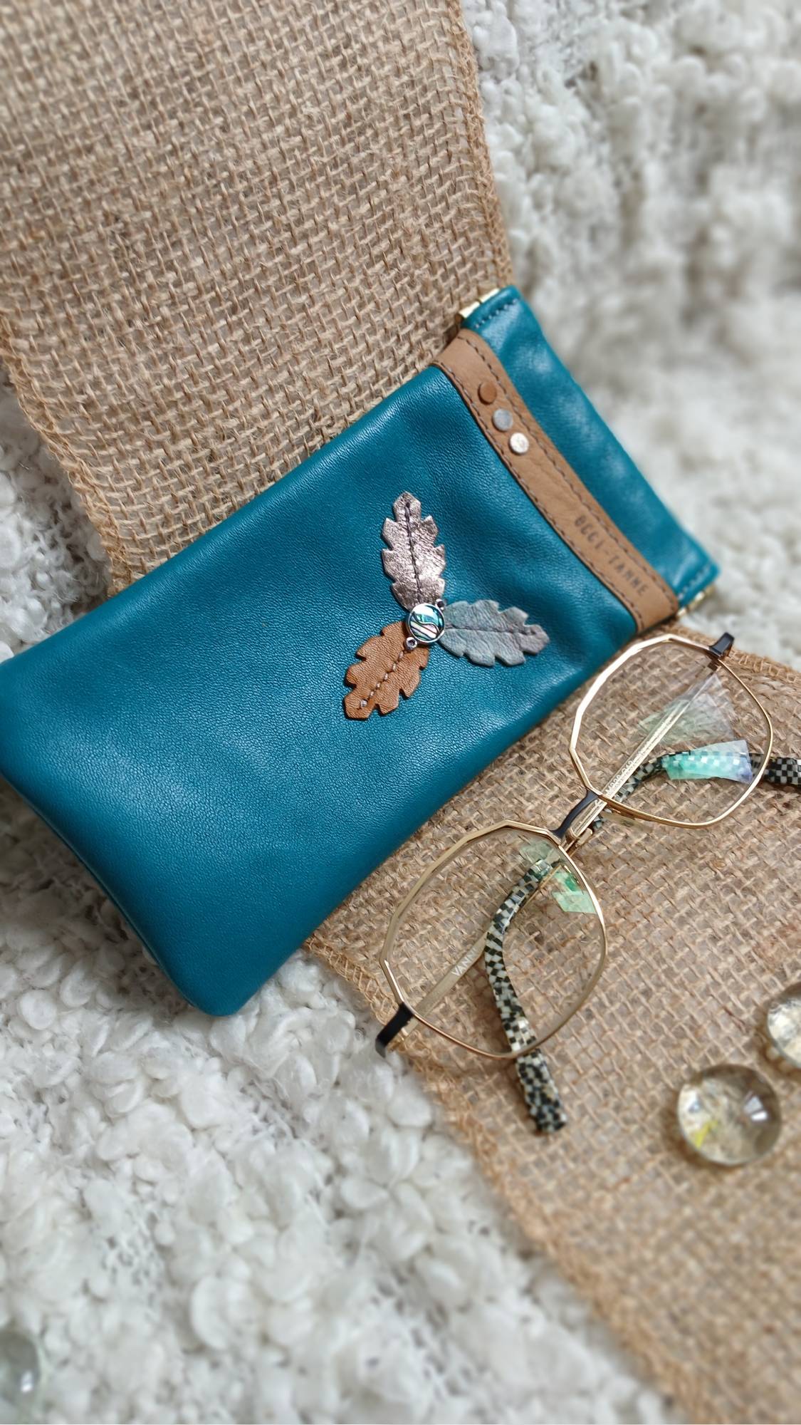 L’étui à lunettes « Aquaverdé » protège vos montures avec élégance. Confectionné en cuir turquoise upcyclé, il se pare, sur le dessus, d’un motif original : trois feuilles en cuir — marron clair, argenté et moucheté bleu clair — disposées comme une étoile à trois branches. Au centre, un délicat élément issu d’un bracelet de seconde main, aux reflets irrisés bleu, vert, rose et violet, souligne la finesse de ce travail fait main. Tout en haut, une fine bande de cuir beige-marron, estampillée du logo Occi-Tanne, est agrémentée de trois pastilles de cuir, rappelant les teintes des feuilles décoratives. Cet accessoire féminin conjugue style, protection et démarche écoresponsable, grâce à l’emploi de cuir upcyclé et à des détails cousus entièrement à la main. Associez-le à d’autres créations de la catégorie « Complices Aquaverdé » pour coordonner vos accessoires et affirmer votre personnalité jusque dans les moindres détails. CHIFFONNETTE OFFERTE