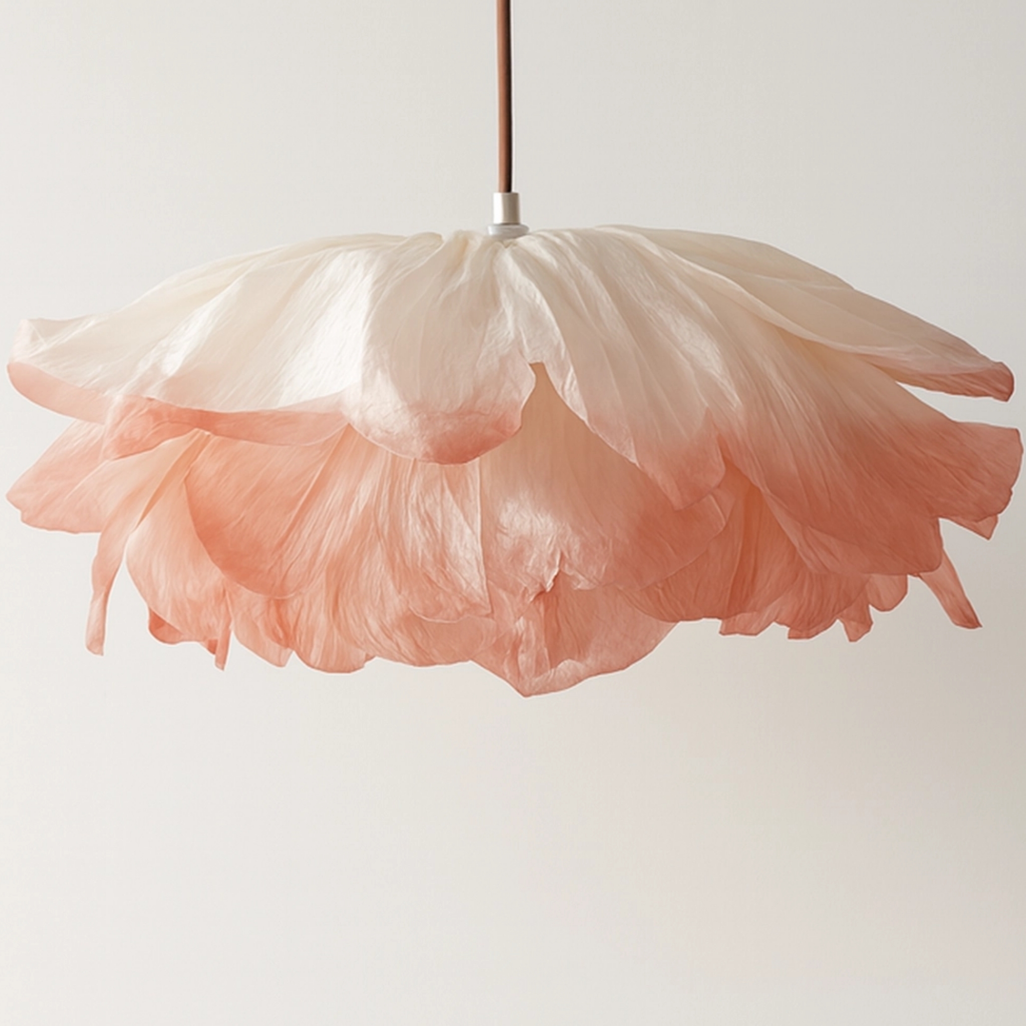 Éblouissante comme une fleur de feu, cette suspension est réalisée avec des pétales de soie jaune orangé découpés et assemblés à la main, réchauffant l’âme et l’espace d’une lumière dorée.