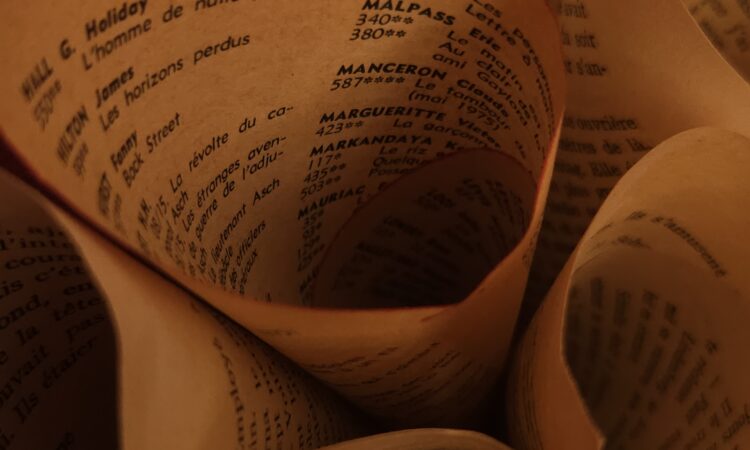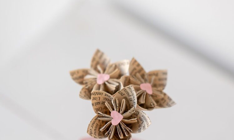 Fleurs de papier (à l’unité ou en bouquet) créées à partir de papier upcyclé : BD, romans, Partitions musicales, cartes routières….