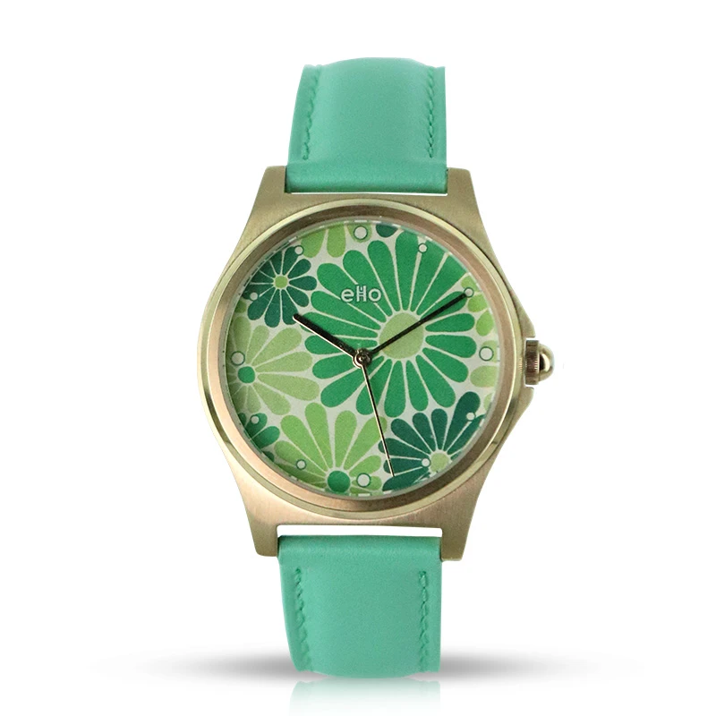 Cette montre eHo au design audacieux et plein de fraîcheur marquera les tenues de notre printemps été et affirmera un engagement sans contrainte pour une consommation durable. Conçue avec des composants issus du recyclage. Des matériaux sélectionnés pour leur qualité et leur précision. Montre ronde au boitier en acier, finition doré rose, diamètre de 39 mm, cadran imprimé de fleurs coloris verts, bracelets en cuir lisse vert d’eau surpiqué vert clair, mouvement à quartz 3 aiguilles, aucun contact avec l’eau, garantie 2 ans.